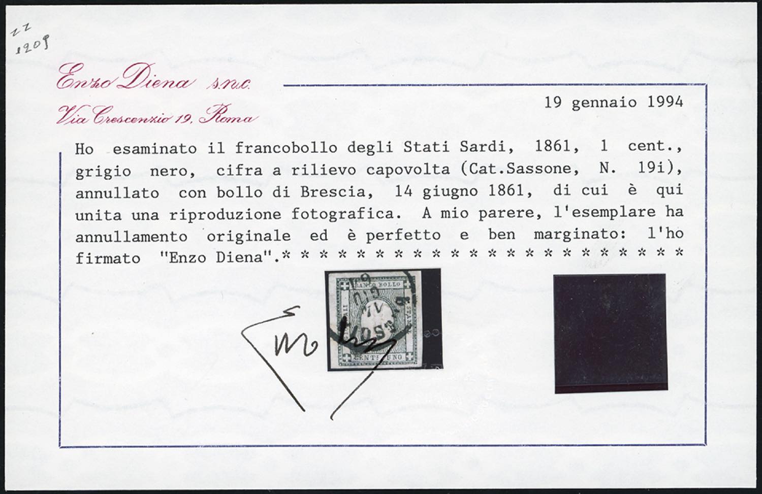 1861 - 1 cent. grigio nero, CIFRA CAPOVOLTA (19i), perfetto, usato a Brescia 16/6/1861. Si tratta probabilmente del migliore esemplare noto ... Leggi tutto