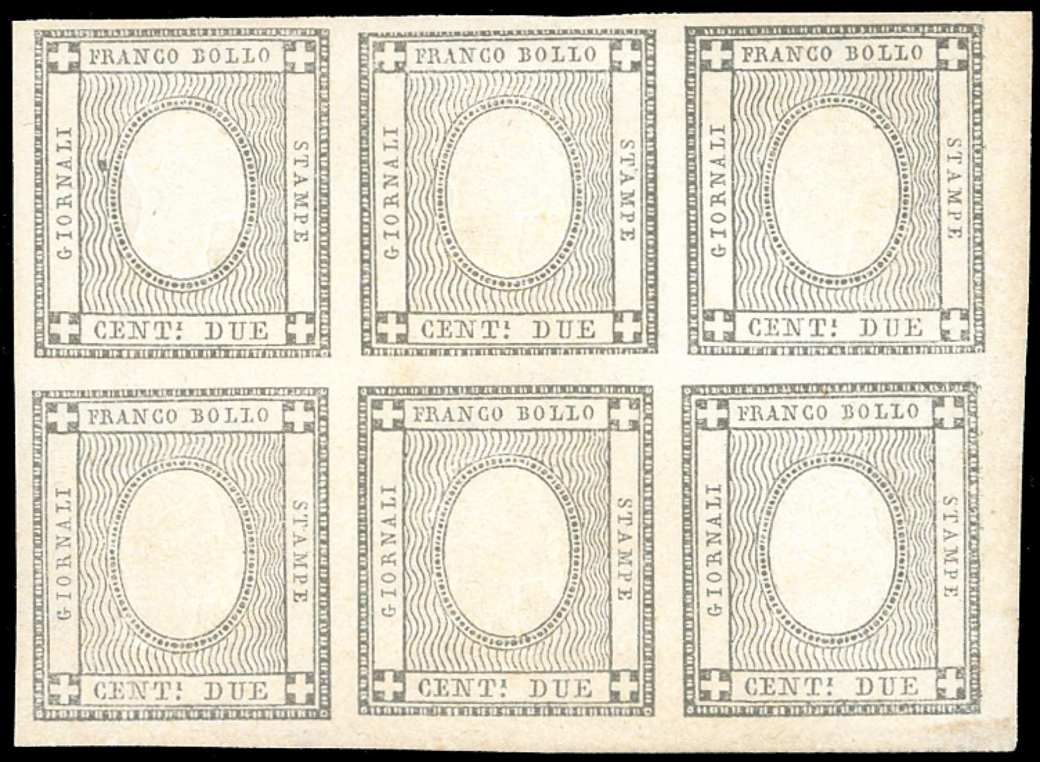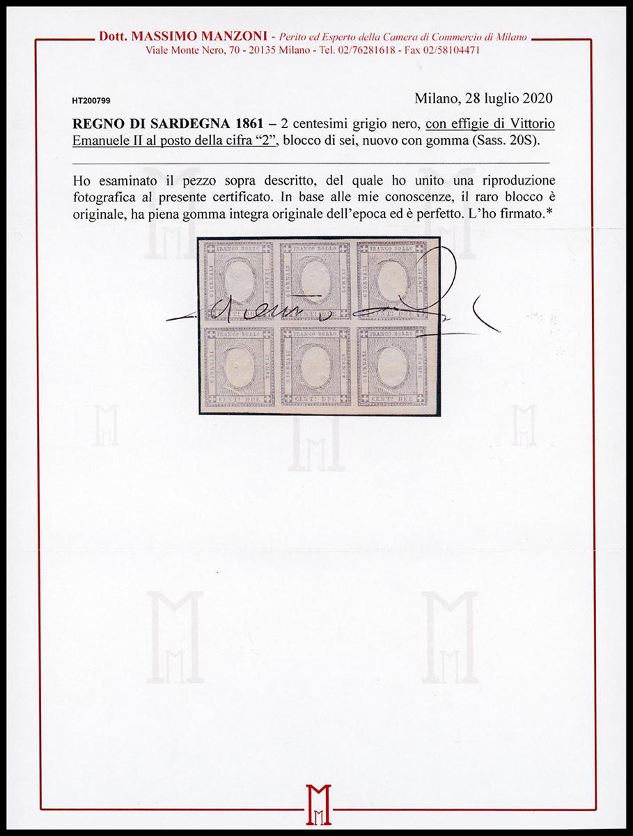 1861 - 2 cent. grigio nero, effigie di Vittorio Emanuele II al posto della cifra, francobollo sperimentale (20S), blocco di sei esemplari, gomma originale integra, perfetto. Estremamente raro in blocchi. E.Diena, cert. Manzoni.