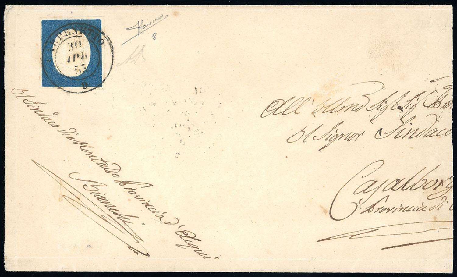 PIEMONTE-CARPENETTO d.c. D punti 6- 20 cent. azzutto, III emissione (8), perfetto su lettera del 30/4/1855 a Casalborgo. A.Diena, cert. Sorani.