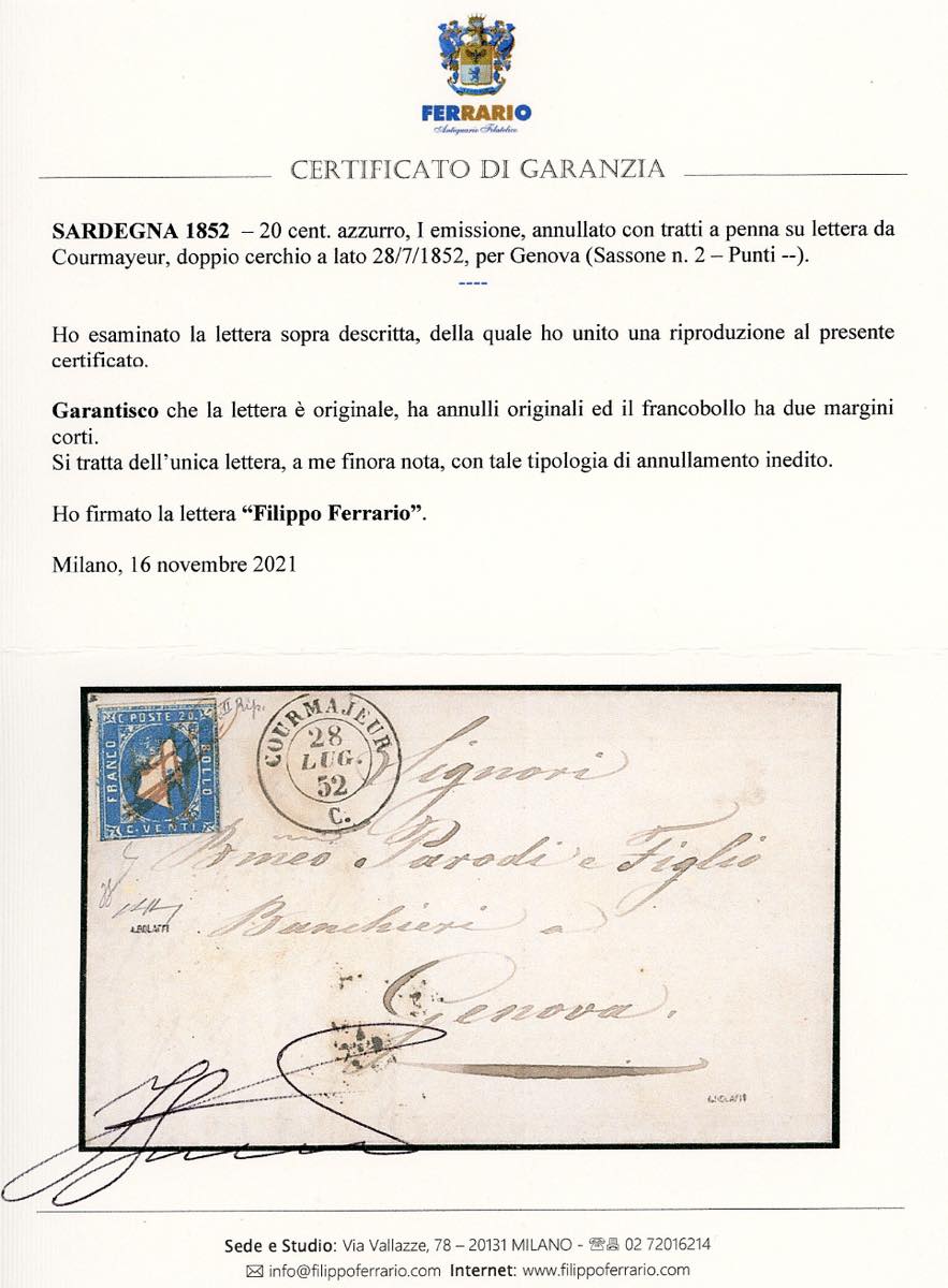 PIEMONTE-COURMAJEUR, tratti di penna e 2C, non catalogato - 20 cent. azzurro (2), due margini corti, su fresca lettera del 28/7/1852 per Genova. Si tratta dell'unica lettera nota con tale tipologia d'annullamento, finora inedito. Molto fresco. G.Bolaffi, A.Bolaffi, cert. Ferrario.