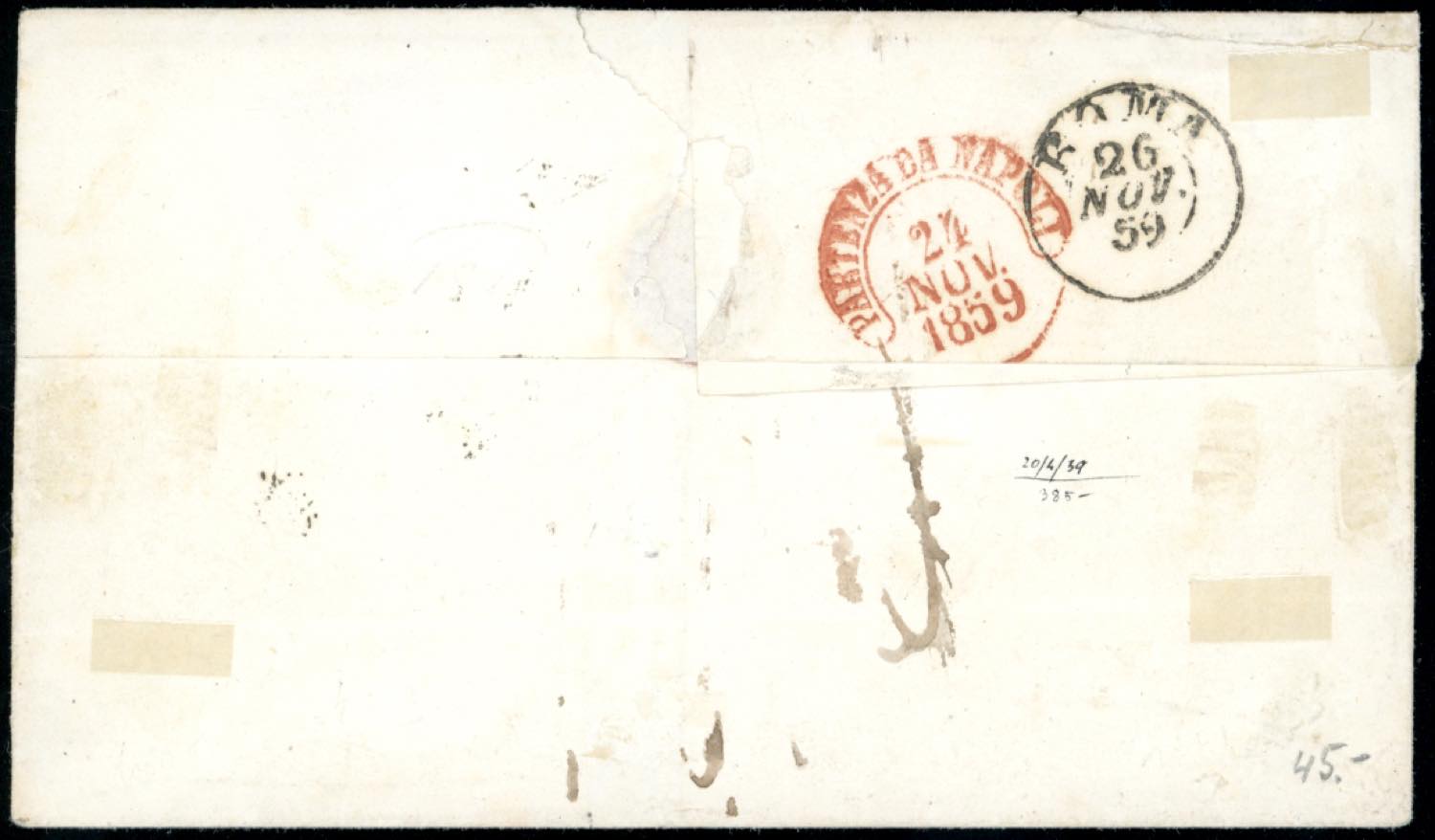 1859 - 10 grana azzurro cupo, ritocco pos. 1 (12), perfetto, isolato su sovracoperta di lettera da Palermo 23/11/1859 a Roma, tassata 24 bajocchi. È stato ritagliato un frammento con il francobollo, ora riapplicato nella posizione originaria. Rara. Ferrario.
