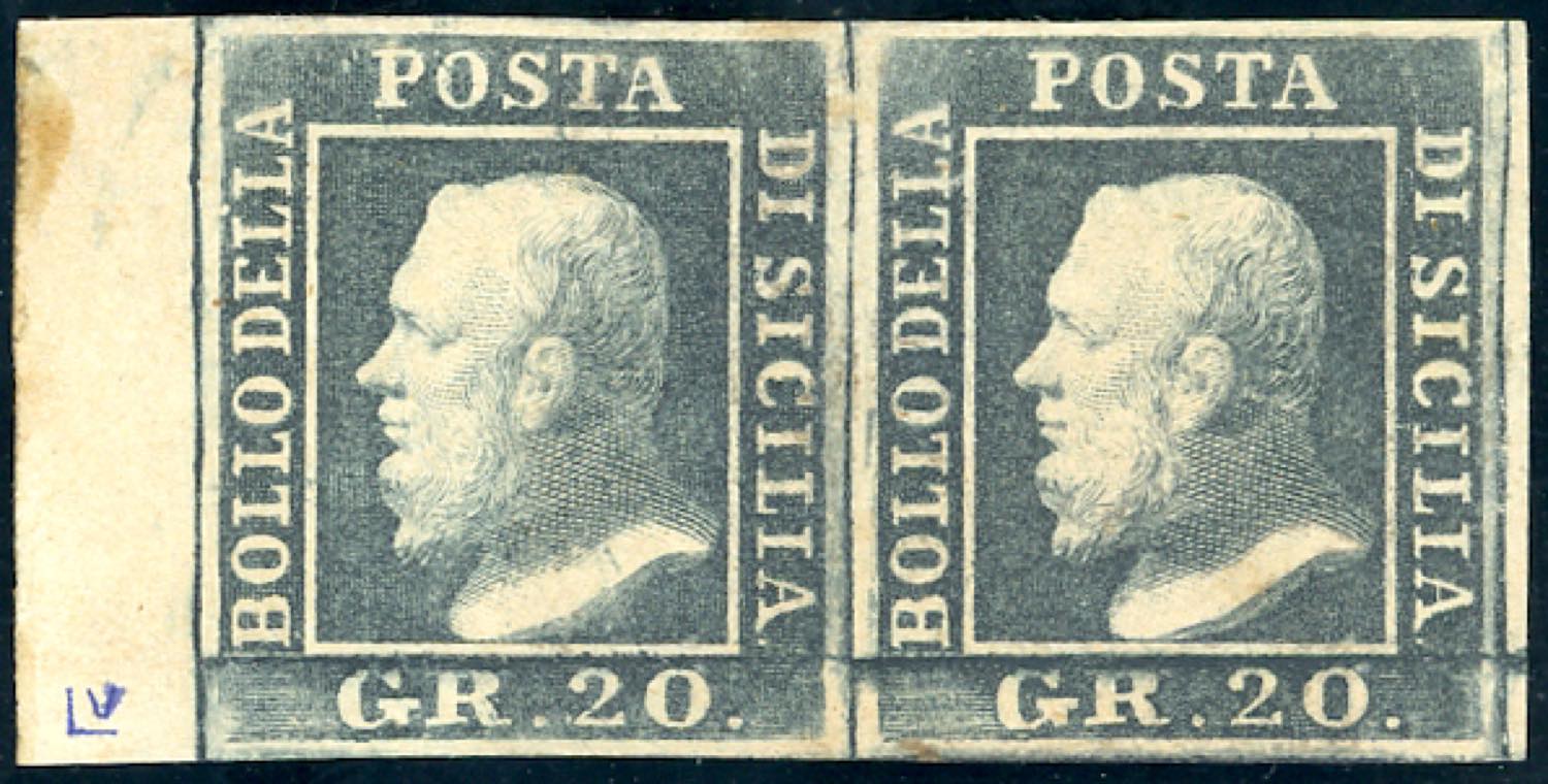 1859 - 20 grana grigio ardesia (13), coppia orizzontale, pos. 21-22, bordo di foglio, gomma originale, perfetta. A.Diena, Raybaudi.