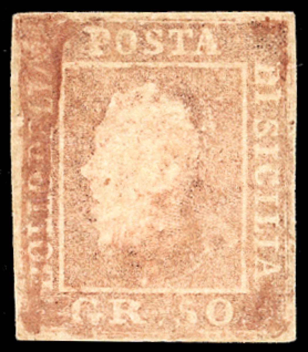 RISTAMPE - 50 grana ristampa da clichè originale in color rosso bruno, come sempre sbiadita nei particolari, gommata, perfetta. Tale ristampa, eseguita precedentemente da Taormina e Zito, fu posta in vendita nel 1938 (vedi libro Nino Aquila). Pochi esemplari esistenti. Cert. Ferrario.