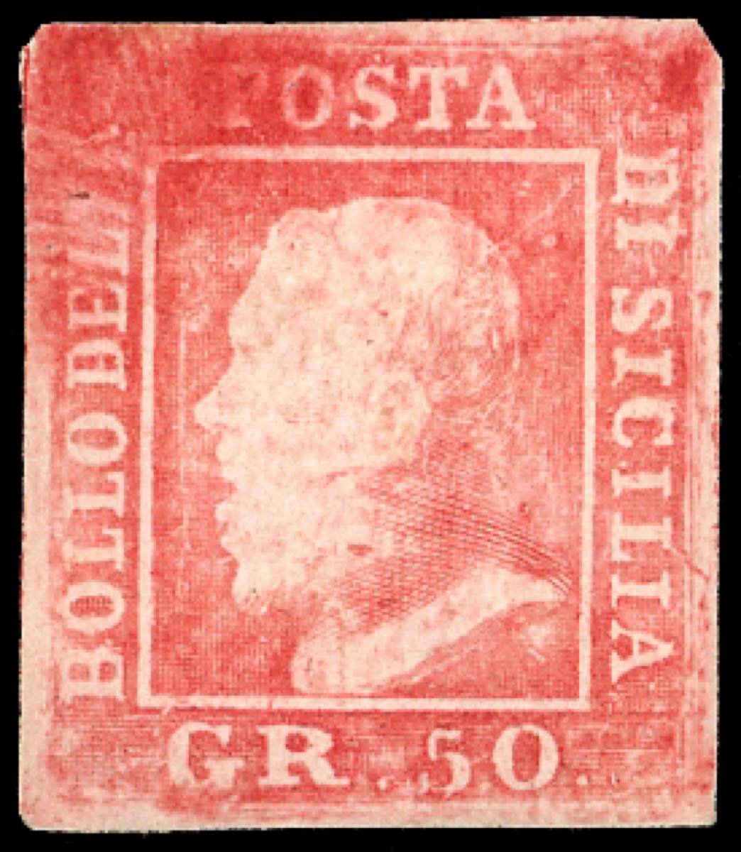 RISTAMPE - 50 grana ristampa da clichè originale in rosso vivo, come sempre sbiadita nei particolari, gommata, perfetta. Tale ristampa, eseguita precedentemente da Taormina e Zito, fu posta in vendita nel 1938 (vedi libro Nino Aquila). Pochi esemplari esistenti. Cert. Ferrario.