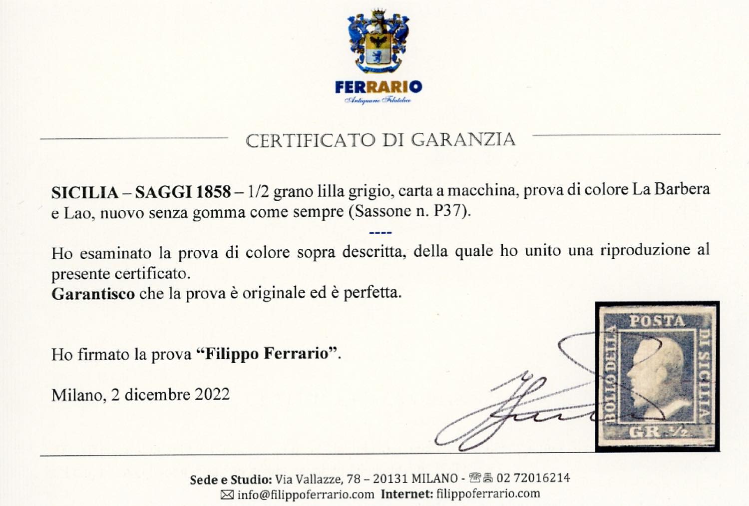1858 - 1/2 grano lilla grigio, carta a macchina, prova di colore La Barbera e Lao (P37), senza gomma come sempre, perfetta. Pochi esemplari esistenti. A.Diena, cert. Ferrario.