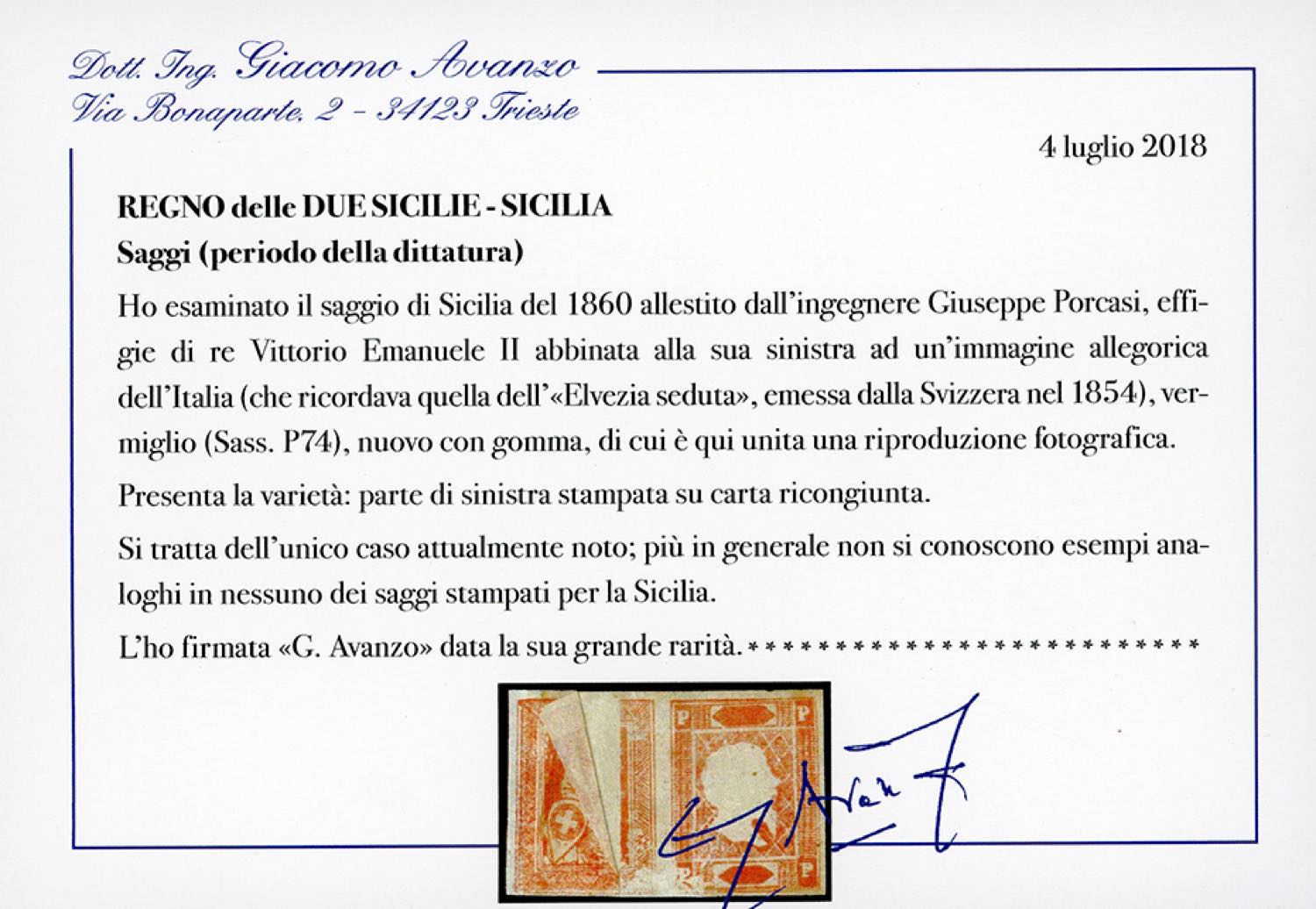 1860 - Saggio tipo Helvetia di Porcasi, il primo esemplare stampato su carta ricongiunta (P74,nota), il secondo esemplare (senza varietà) è difettoso, gomma originale, ottimi margini. Si tratta dell'UNICO ESEMPLARE NOTO DI TUTTI I SAGGI DI SICILIA SU CARTA RICONGIUNTA. Grande rarità del settore. (Quotazione Sassone per il normale € 26.000). Vaccari, cert. Avanzo e Ferrario.