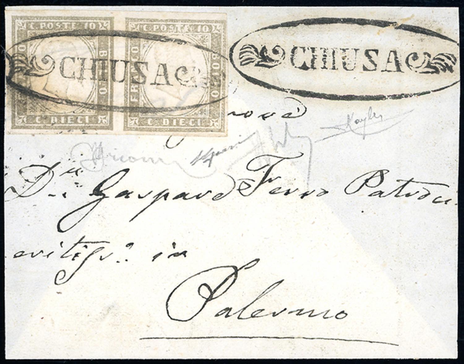 CHIUSA, ovale punti R1 - 10 cent. grigio olivastro chiaro IV emissione di Sardegna (14C), coppia, perfetta, su fresco frontespizio di lettera per Palermo. Molto raro e di ottima qualità. Grioni, cert. Raybaudi e Gazzi.