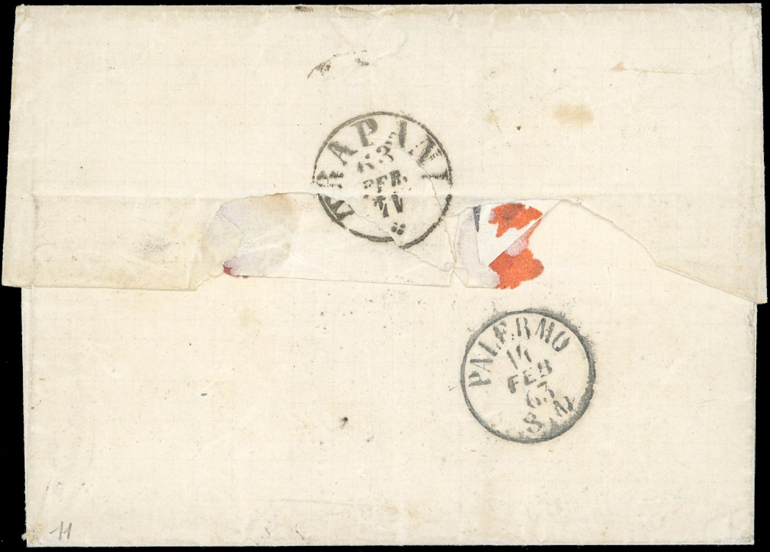 SPADAFORA, sardo italiano punti 13 - 15 cent. tipo Sardegna, due esemplari, uno azzurro e uno azzurro grigio (11,11e), ottimo stato, su sovracoperta di lettera affrancata insufficientemente del 12/2/1863 a Trapani, con segno di tassa cassato e corretto. Insieme unico, impreziosito dalla presenza di valori gemelli. Gaggero, cert. Sorani.