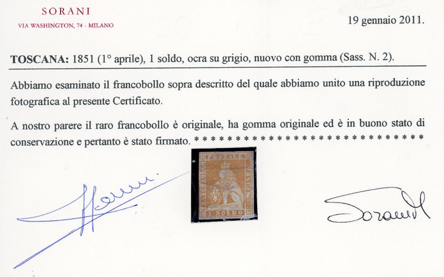 1851 - 1 soldo ocra su grigio (2), varietà clichè, nuovo, gomma originale, buono stato. Raro e di ottimo aspetto. Cert. Sorani.