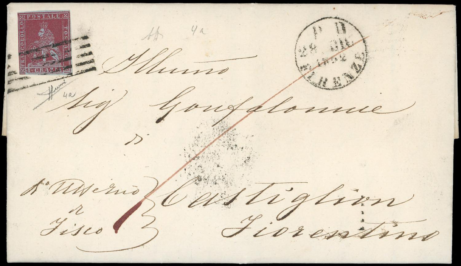 1852 - 1 crazia carminio cupo su azzurro (4a), appena sfiorato a sinistra, isolato su lettera da Firenze 28/12/1852 a Castiglion ... Leggi tutto