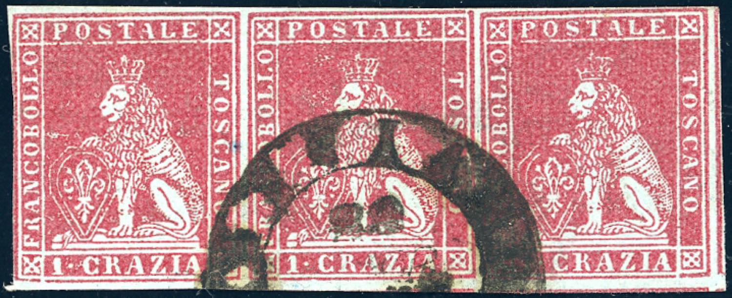 1851 - 1 crazia carminio su grigio (4d), striscia di tre, margini da eccezionali a giusti, usata. Molto fresca. Ferrario.