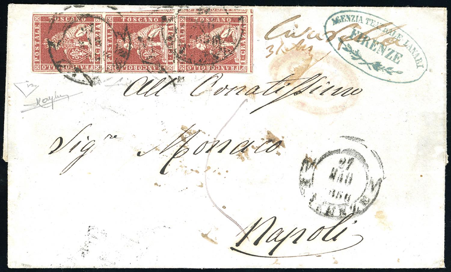 1856 - 1 crazia carminio bruno su grigio (4e), striscia verticale di tre margini da eccezionali a completi, perfetta, su lettera da Firenze 27/5/1856 a Napoli, tassata, sul fronte bollo ovale rosso AGDP. Molto bella. Raybaudi, Fiecchi, cert. E.Diena.