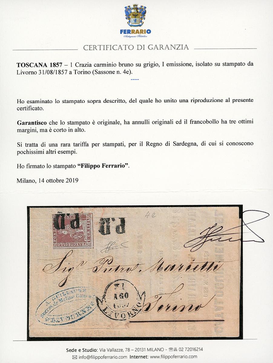 1857 - 1 crazia carminio bruno su grigio (4e), tre ottimi margini, leggermente corto in alto, isolato su stampato da Livorno 31/8/1857 a Torino. Tariffa di stampati per il Regno di Sardegna molto rara, pochissimi casi noti! Cert. Ferrario.