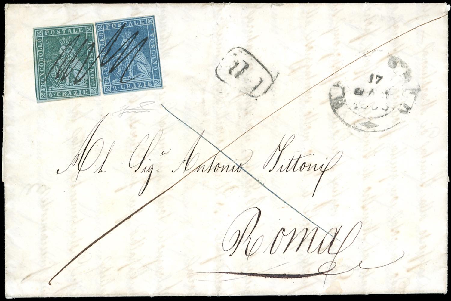 1853 - 2 crazie azzurro grigio su azzurro, 4 crazie verde azzurro su azzurro (5a,6a), perfetti, su fresca lettera da Grosseto 17/1/1853 a Roma, annullo grafico a penna. Bellissima. Ferrario.