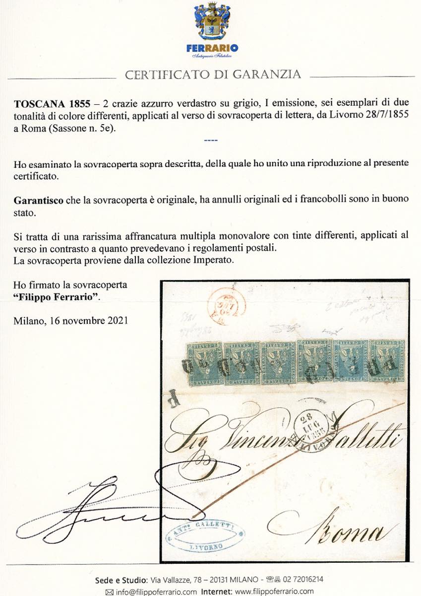 1855 - 2 crazie azzurro verdastro su grigio (5e), sei esemplari di due tonalità di colore differenti, ottimo stato, al verso di sovracoperta di lettera da Livorno 28/7/1855 a Roma. Rarissima affrancatura multipla di valori gemelli di ottima qualità, impreziosita dall'uso al verso, in contrasto con i regolamenti postali. Chiavarello, cert. Ferrario. Ex coll. Imperato.