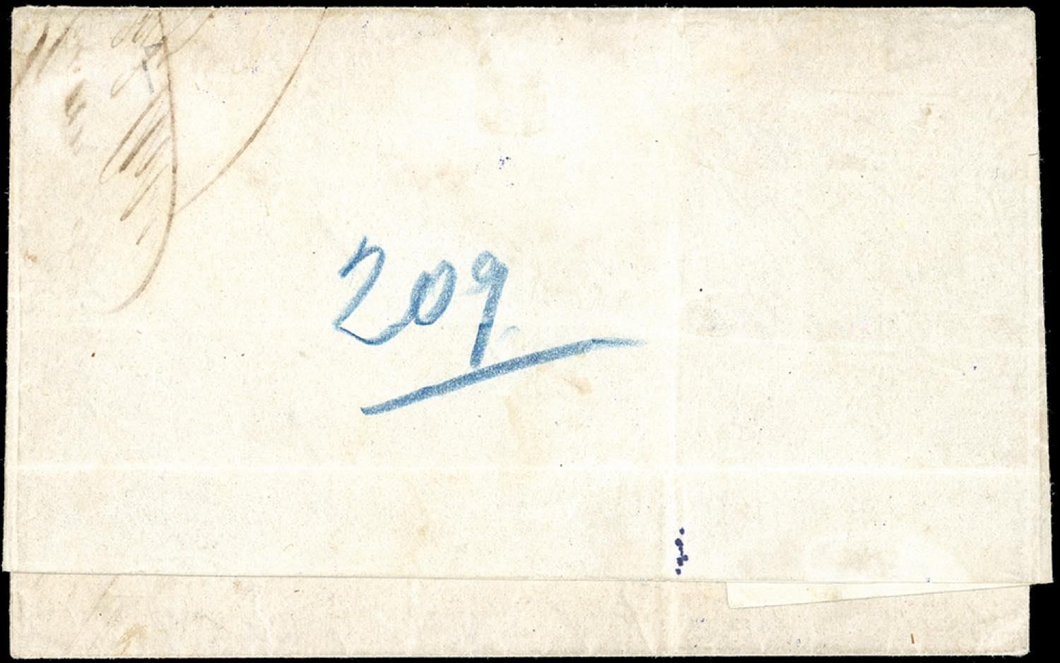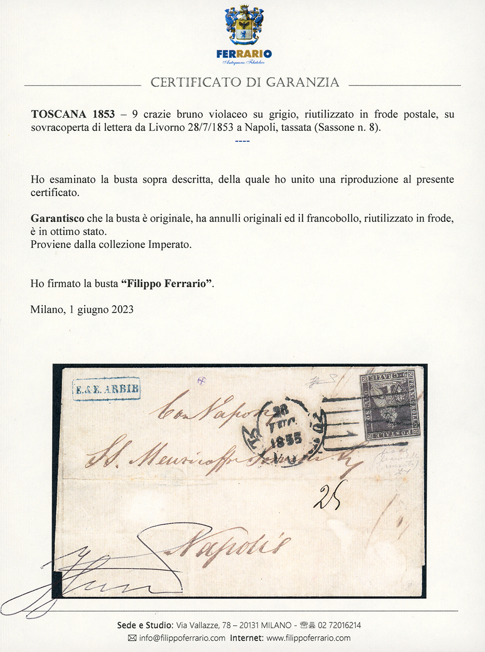 1853 - 9 crazie bruno violaceo su grigio (8), perfetto, ottimi margini, RIUTILIZZATO IN FRODE POSTALE, su sovracoperta di lettera da Livorno 28/7/1853 a Napoli, tassata. Interessante e rara frode di Toscana. Chiavarello, cert. Ferrario. Ex coll. Imperato.