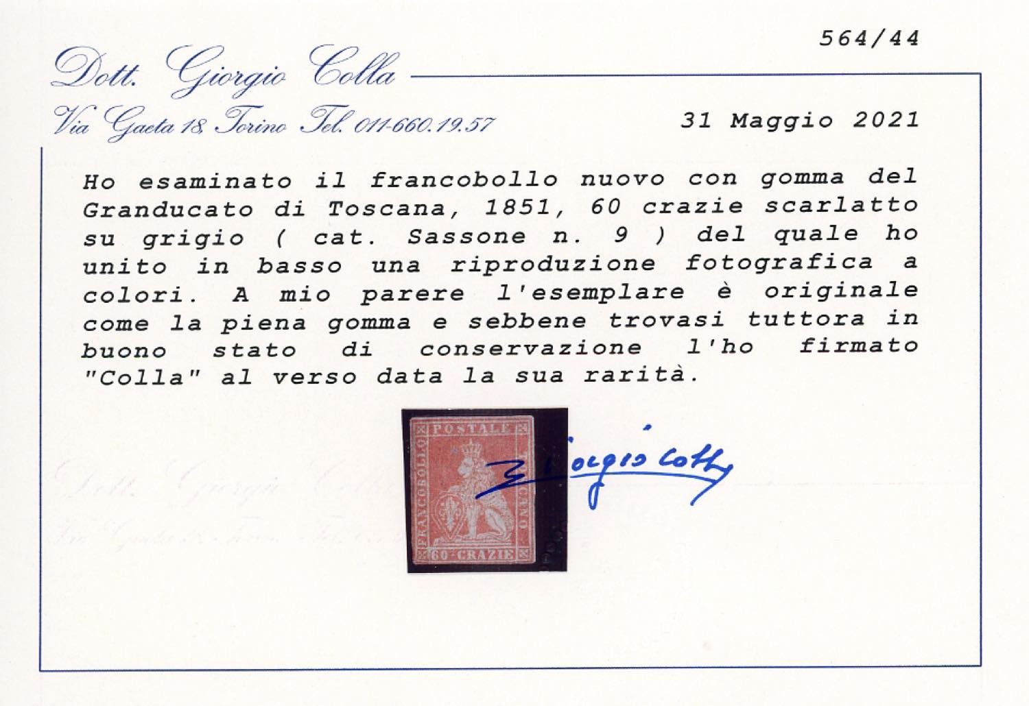 1860 - 60 crazie scarlatto su grigio (9), gomma originale, buono stato. Uno dei più rari francobolli allo stato di nuovo di tutti gli Antichi Stati Italiani. Occasione! Cert. Colla.