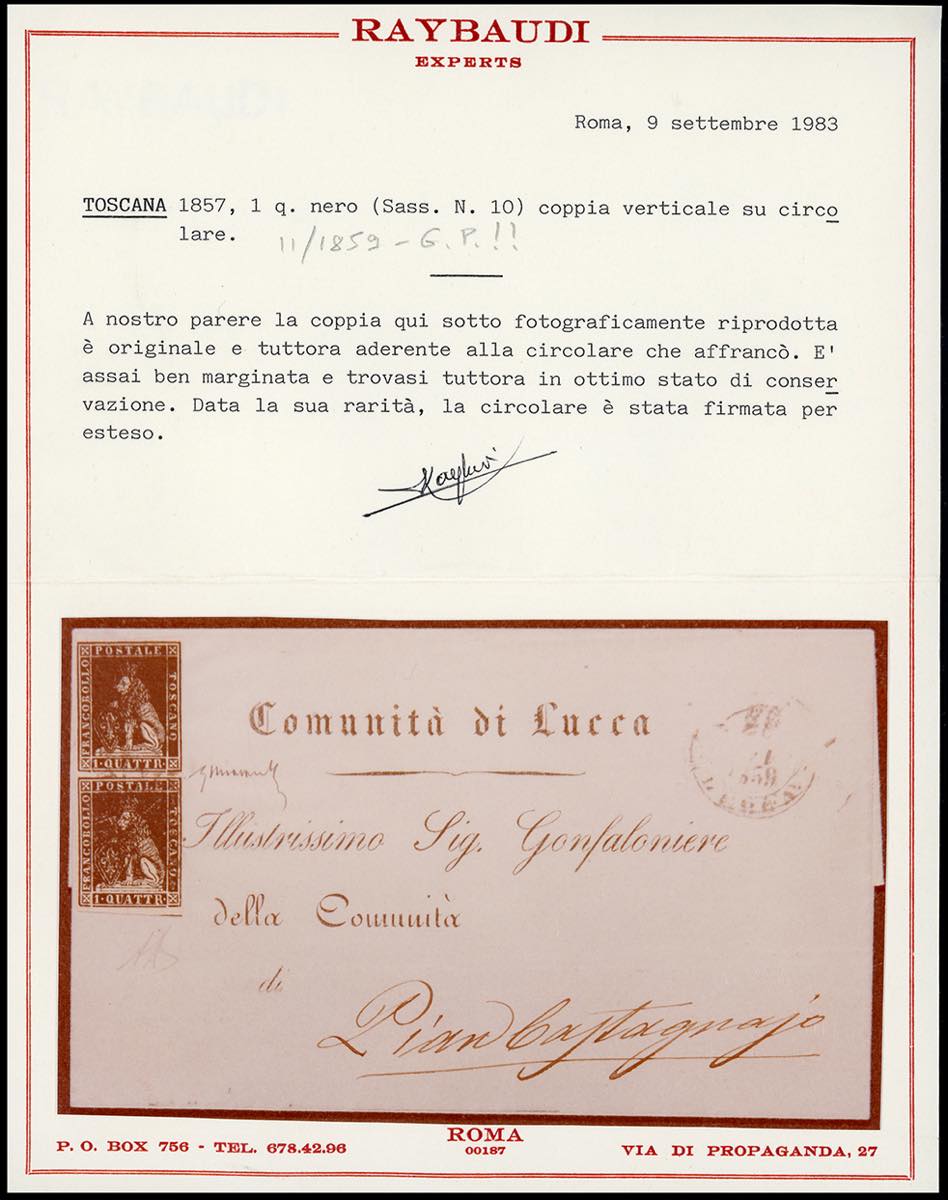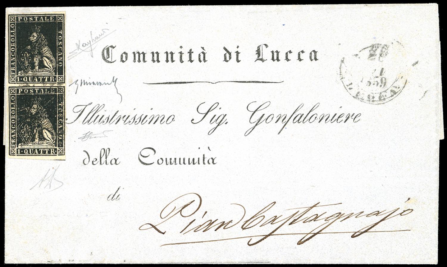 1859 - 1 quattrino nero, II emissione (10), coppia verticale, perfetta e ben marginata, su fresca circolare a stampa da Lucca 29/11/1859 a Pian Castegnaio. Splendida e molto rara in queste condizioni qualitative in periodo di Governo Provvisorio. A.Diena, Chiavarello, cert. Raybaudi.