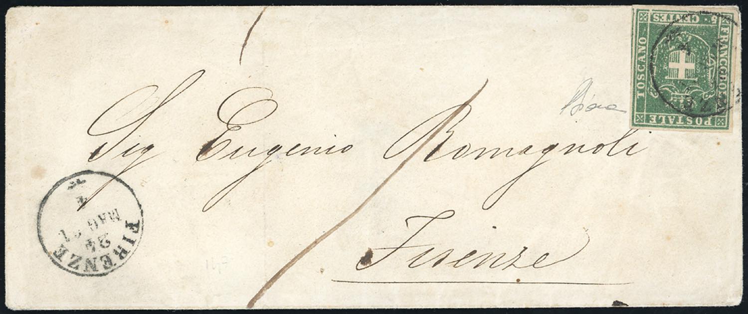 1861 - 5 cent. verde (18), perfetto e ben marginato, isolato su fresca busta da Firenze 24/5/1861 perfetto. Uso isolato molto raro, ... Leggi tutto