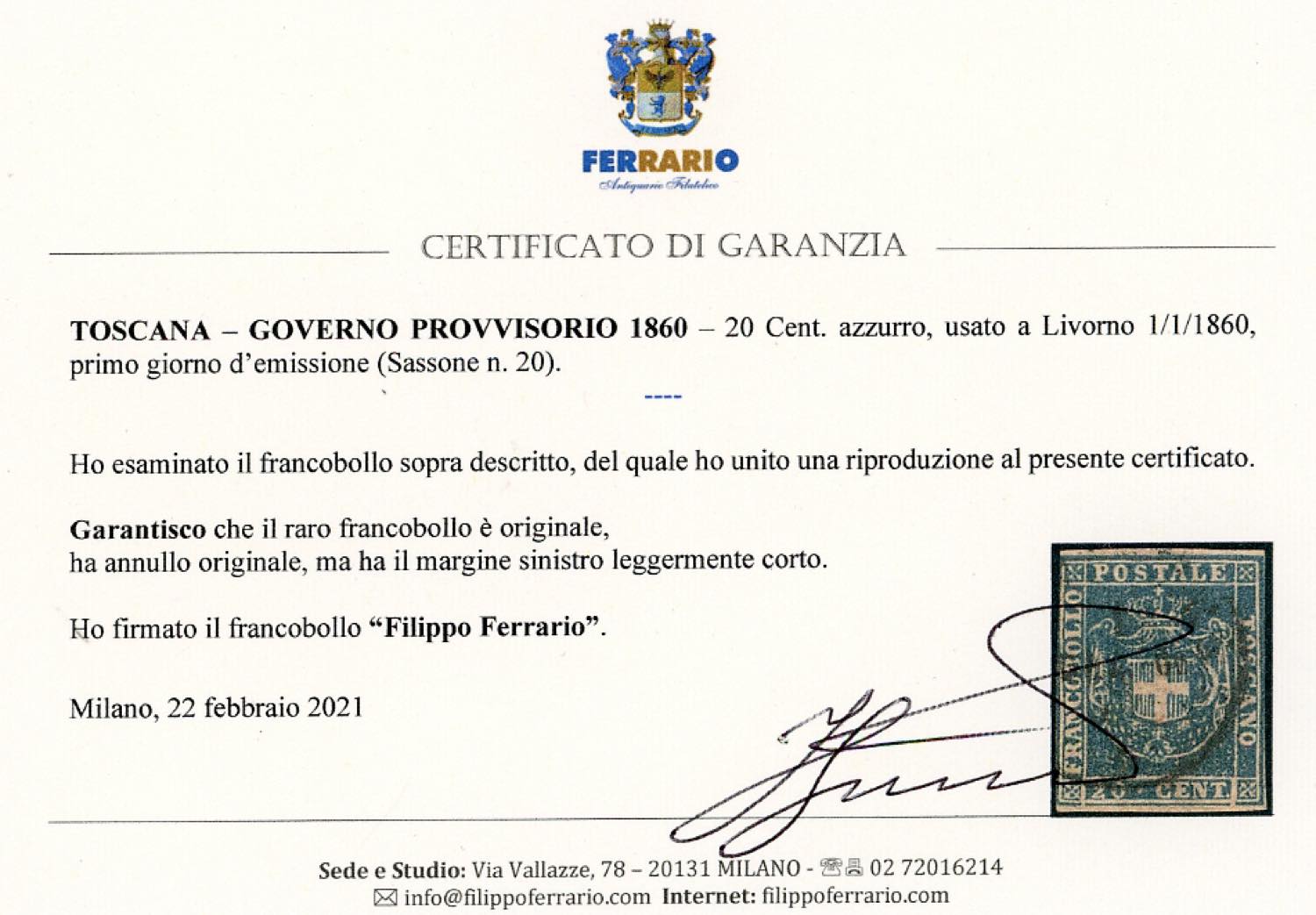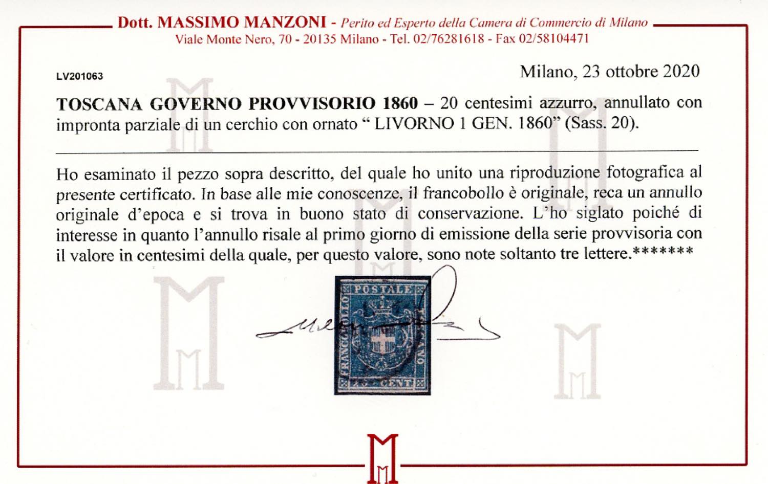 1860 - 20 cent. azzurro (20), due ottimi margini orizzontali, sfiorato a sinistra, usato a Livorno 1/1/1860, PRIMO GIORNO D'EMISSIONE. ... Leggi tutto