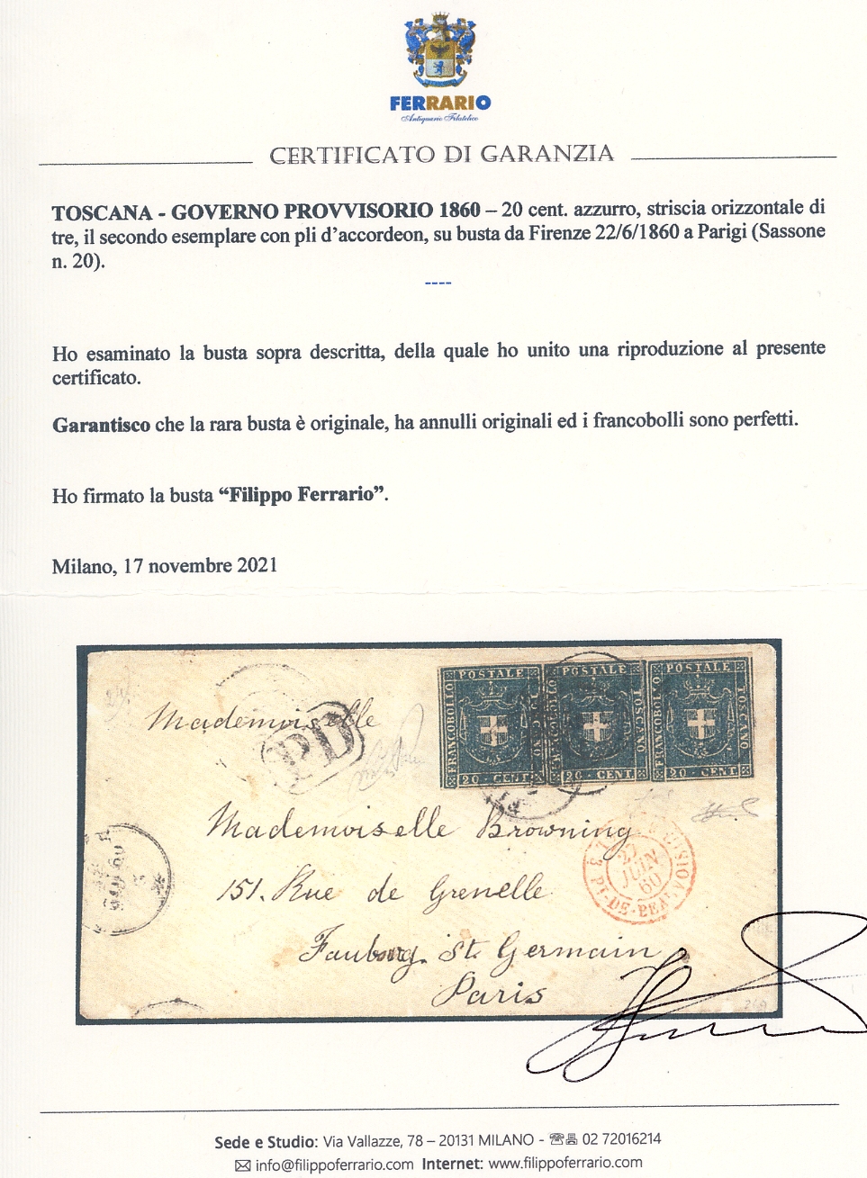 1860 - 20 cent. azzurro (20), striscia verticale di tre, perfetta e ben marginata, il secondo esemplare con pli d'accordeon, su busta da Firenze 22/6/1860 a Parigi. Rara e di ottima qualità. Cert. Ferrario.