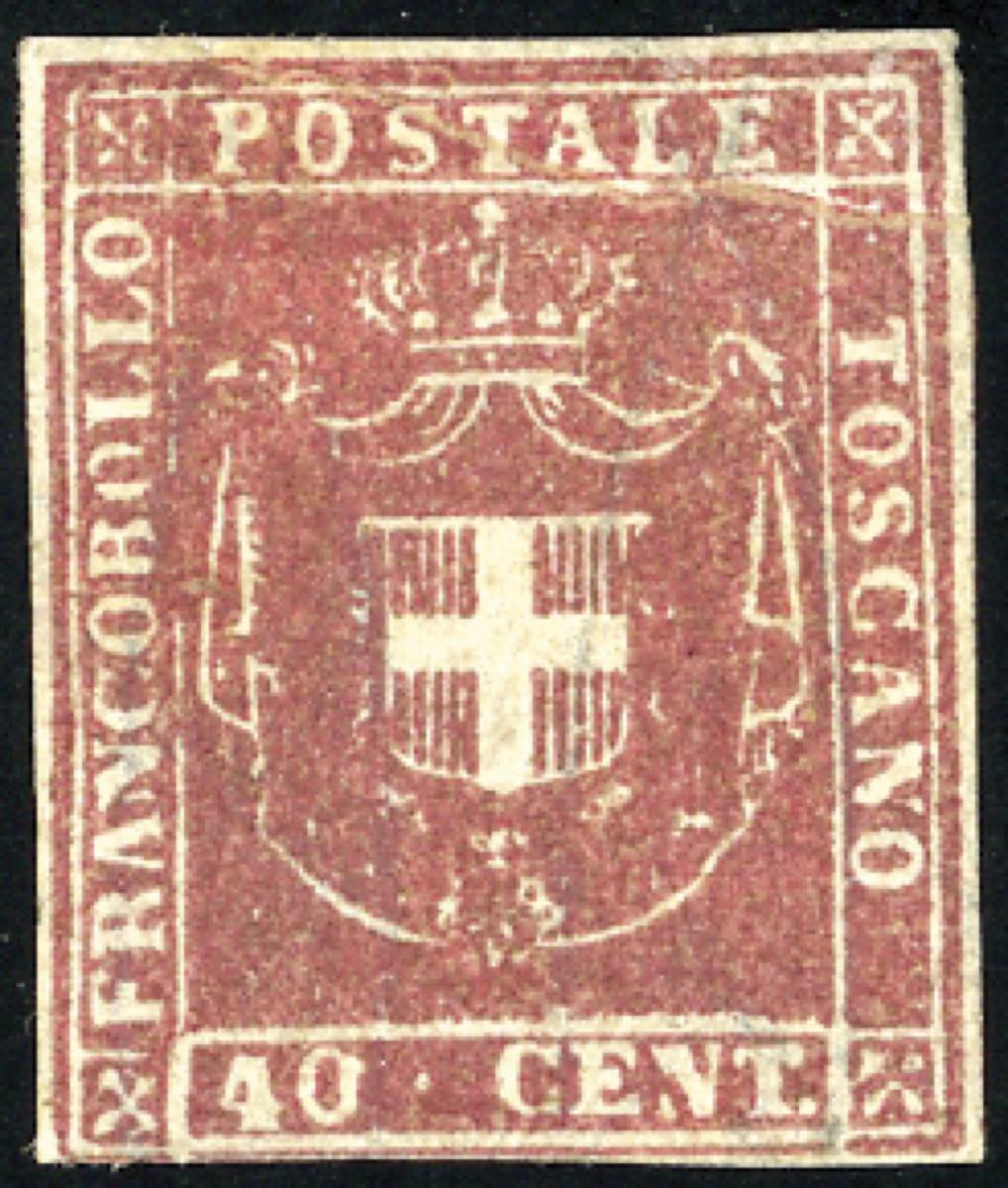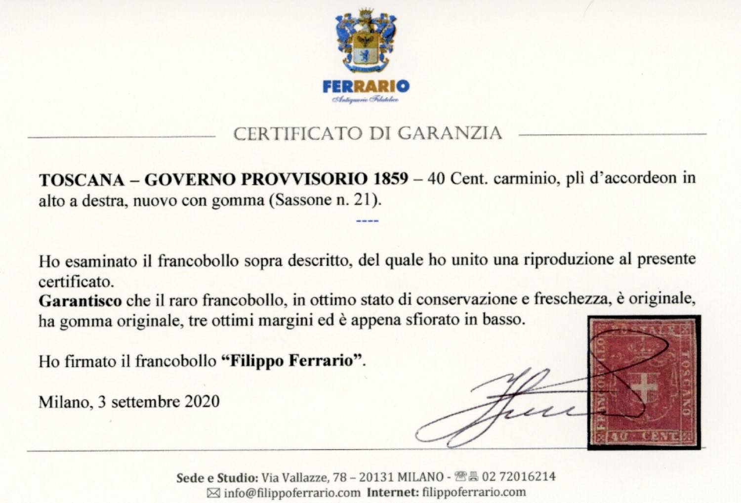 1859 - 40 cent. carminio (21), plì d'accordeon in alto, tre ottimi margini, sfiorato in basso, gomma originale, perfetto. Raro e molto fresco. Cert. storico A.Diena e Ferrario.