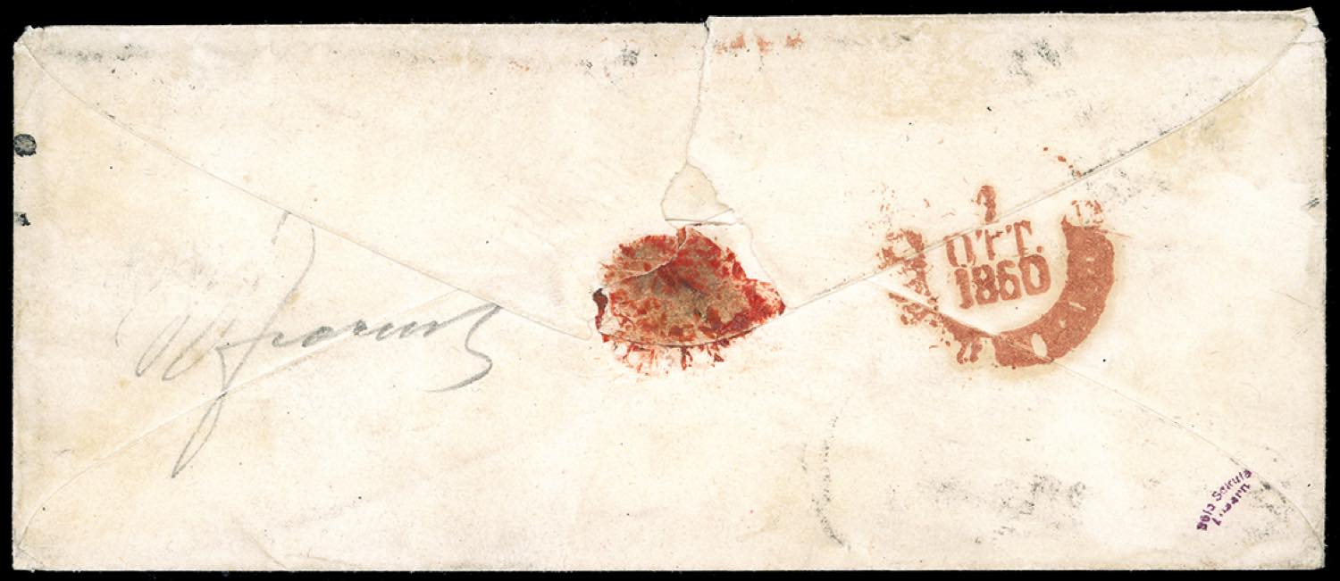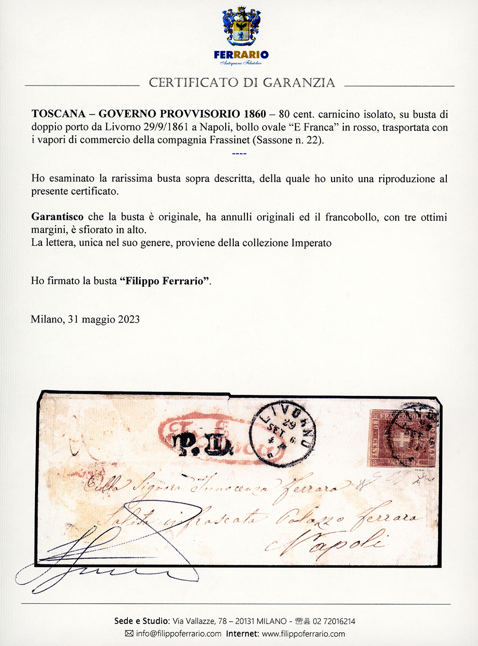 1860 - 80 cent. carnicino (22), tre ottimi margini, sfiorato in alto, su busta di doppio porto da Livorno 29/9/1861 a Napoli, bollo ovale "E Franca" in rosso. Rarissima lettera trasportata con i vapori di commercio della compagnia Frassinet, l'UNICA FINORA NOTA DI DOPPIO PORTO. Em.Diena, Chiavarello, cert. Ferrario. EX coll. Imperato.