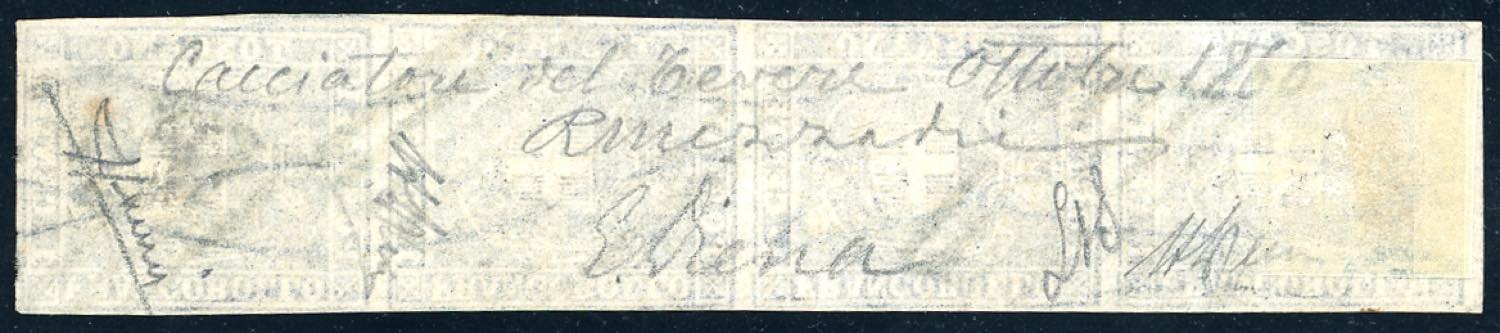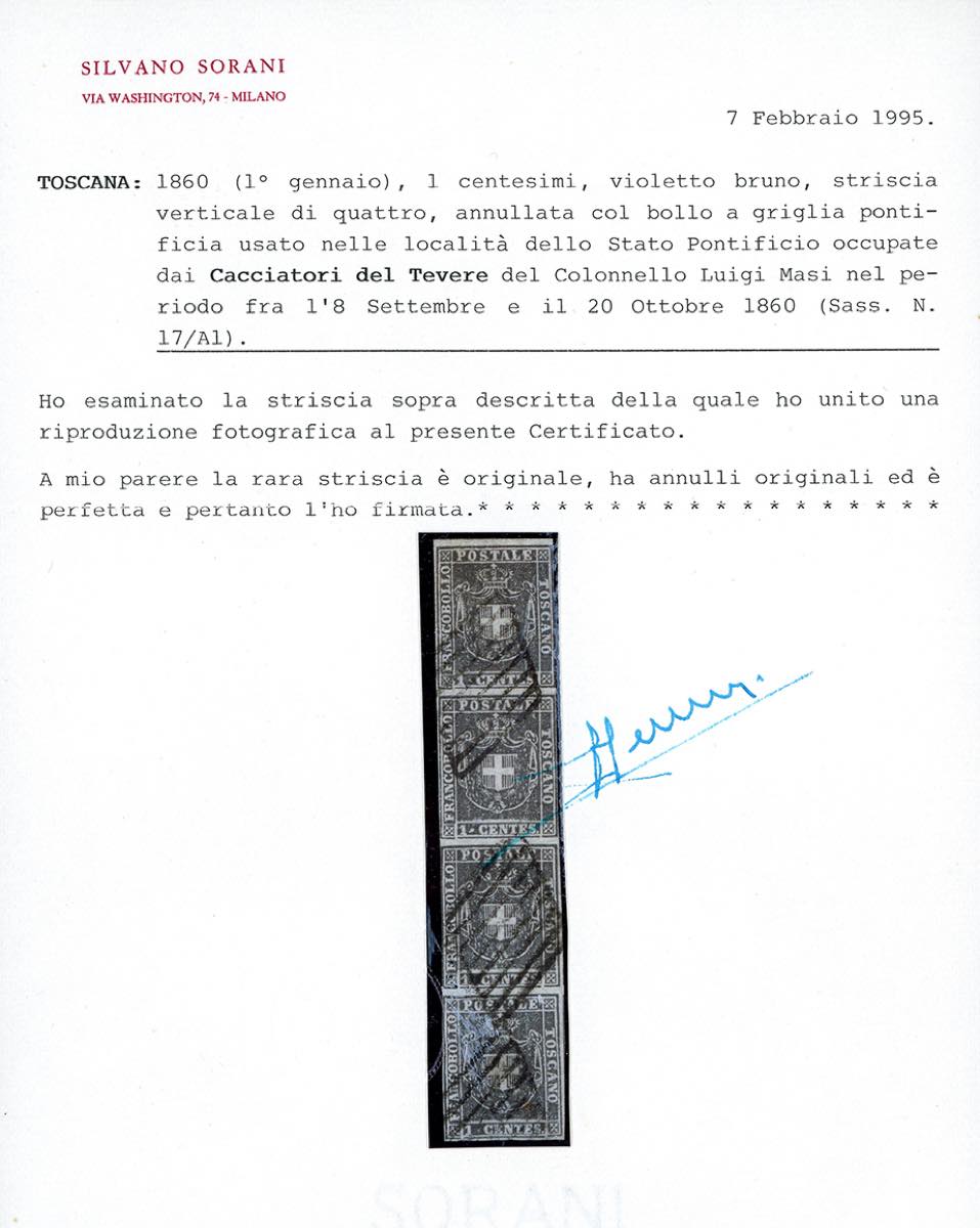 1860 - 1 cent. violetto bruno (17), striscia verticale di 4, perfetta, margini da ampi a completi, annullata con il bollo a griglia pontificia usato nelle località dello Stato Pontificio occupate dai Cacciatori del Tevere del Colonnello Masi nel periodo 8/9-20/10 del 1860. Rarissima e di ottima qualità, probabilmente UNICA. Emilio ed Alberto Diena, Mezzadri, cert. Sorani.