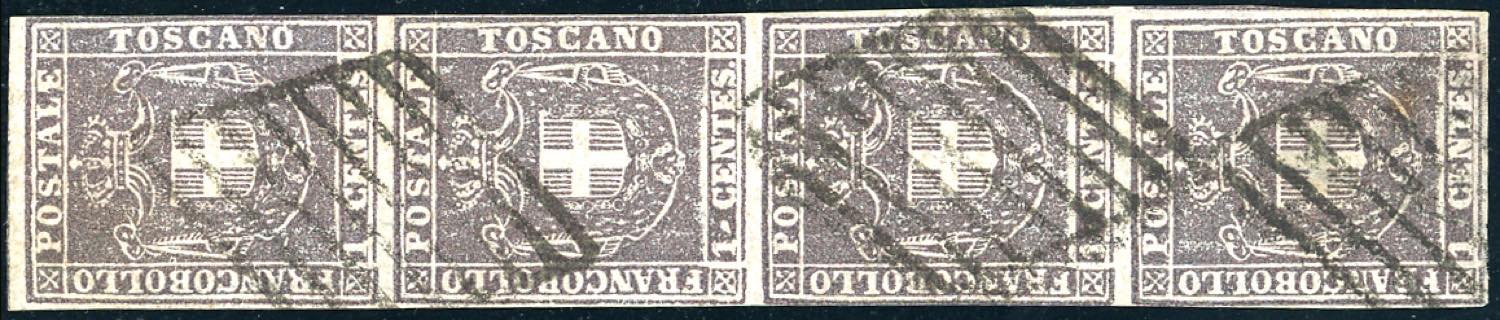 1860 - 1 cent. violetto bruno (17), striscia verticale di 4, perfetta, margini da ampi a completi, annullata con il bollo a griglia ... Leggi tutto