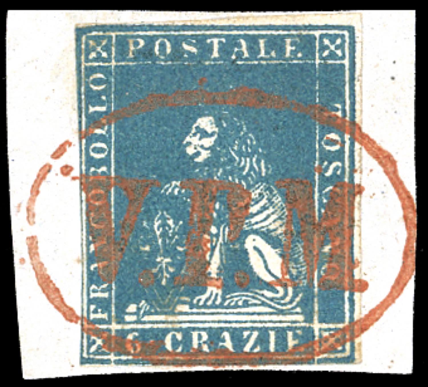 1857 - V.P.M. ovale grande punti R3 - 6 crazie azzurro vivo (15a) leggermente intaccato a sinistra, usato su frammento. Molto raro, ottimo aspetto. Ferrario.