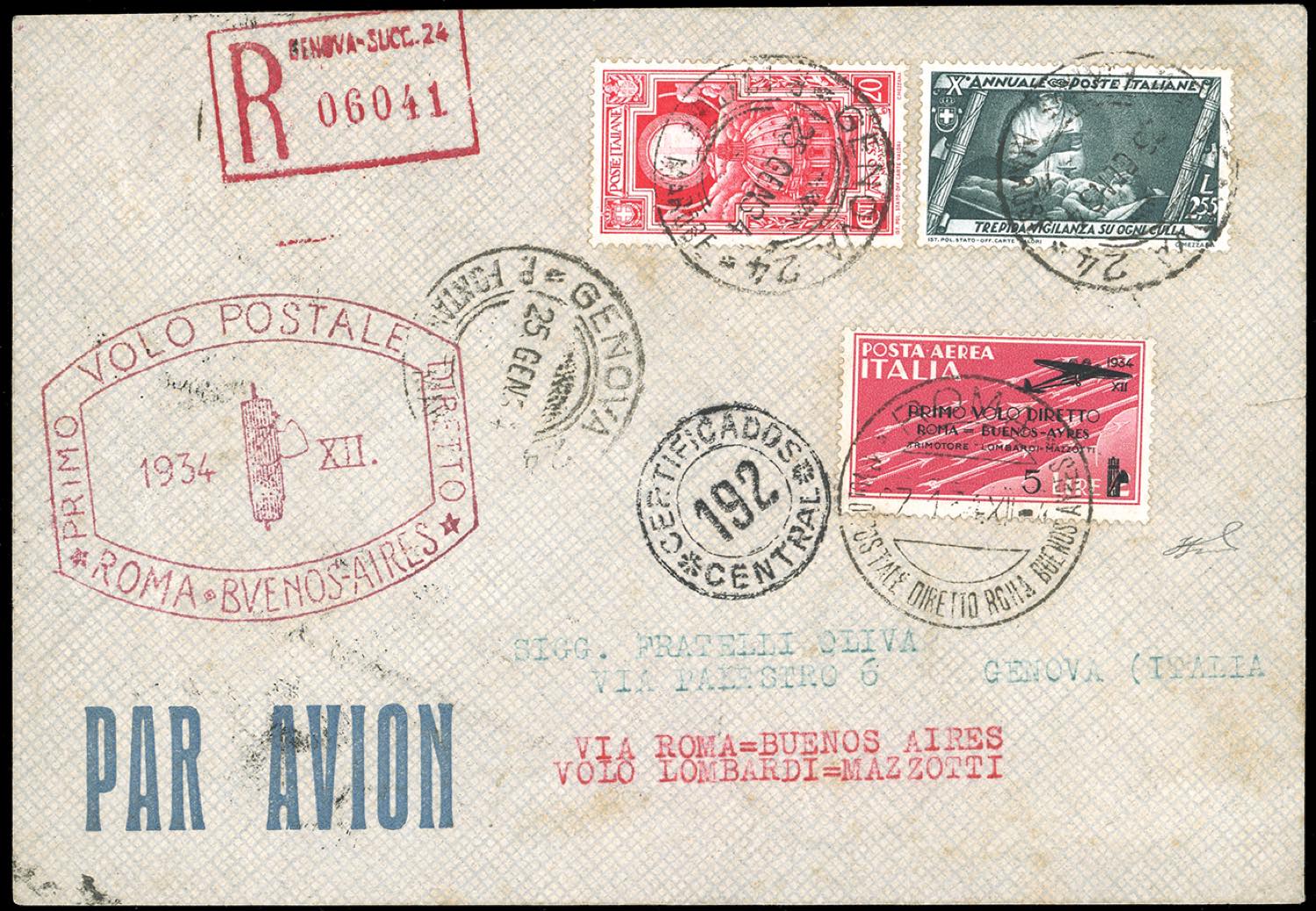 1934 - Volo Roma-Buenos Aires, serie completa (56/59), con complementari, perfetti, su tre distinti aerogrammi raccomandati da Roma 27/1/1934 trasportati con il volo speciale a Buenos Aires, bolli speciali sul fronte e al verso, e rispediti a Genova. Ferrario.