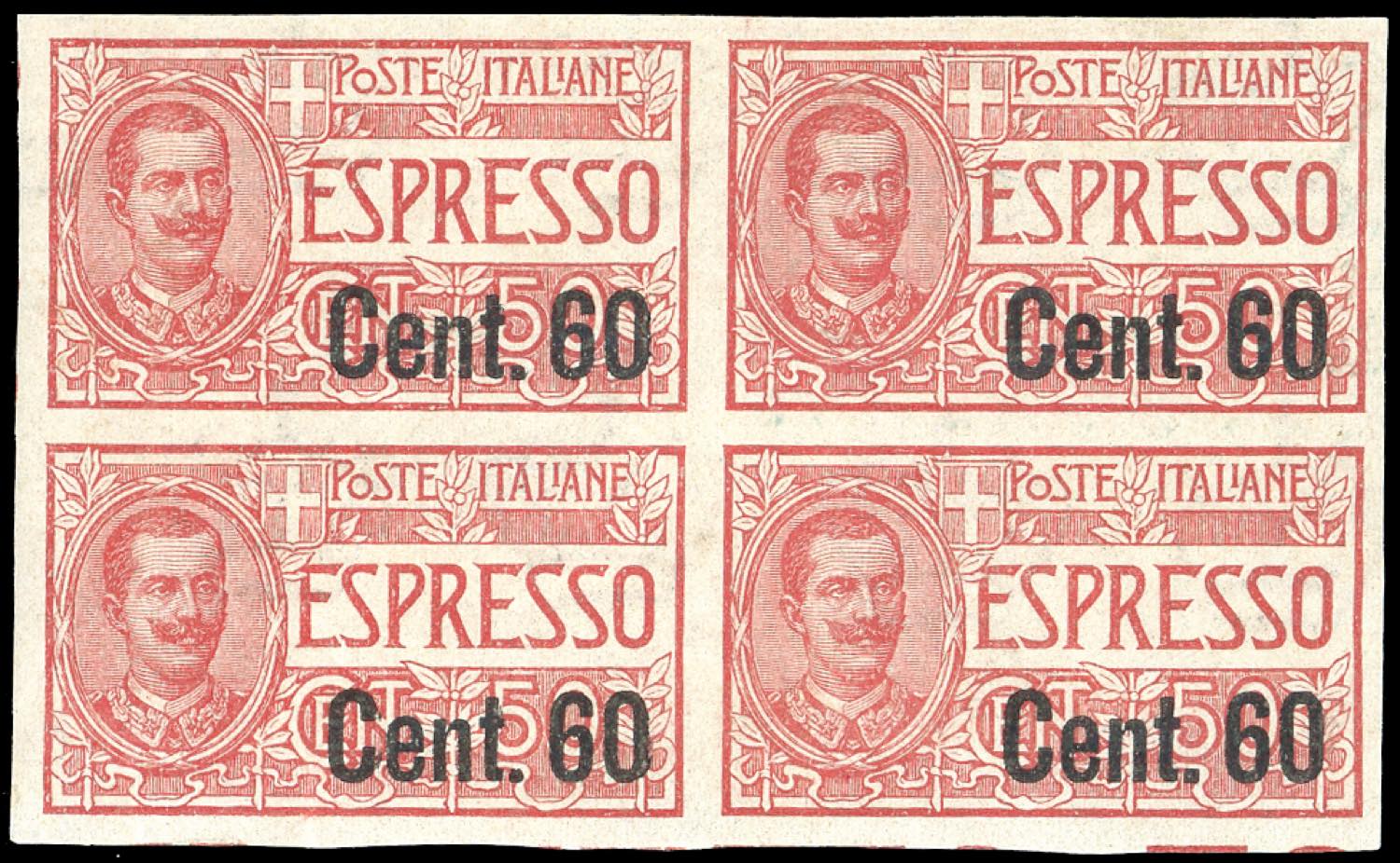 1922 - 60 cent. su 50 cent., non dentellato (6k), blocco di quattro, gomma originale, integra per i due esemplari inferiori, perfetto. Molto fresco. G.Bolaffi, Sassone, Ferrario.