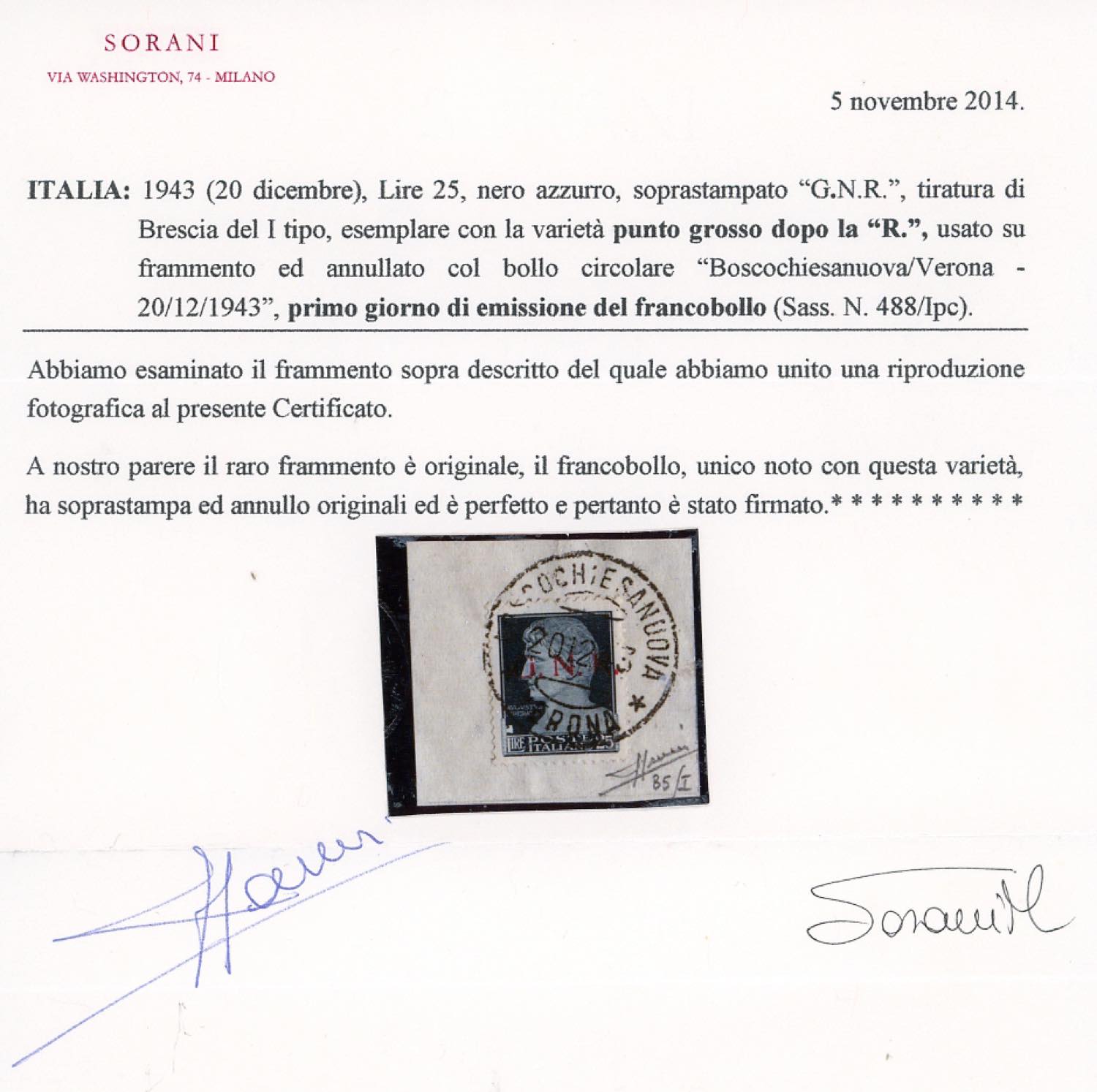 1943 - 25 lire soprastampa G.N.R. di Brescia, I tipo, punto grosso dopo la R (488/Ipc), perfetto, usato su frammento a Boscochiesanuova 20/12/1943, primo giorno d'emissione. UNICO ESEMPLARE NOTO, rarità assoluta del settore. Cert. Sorani.