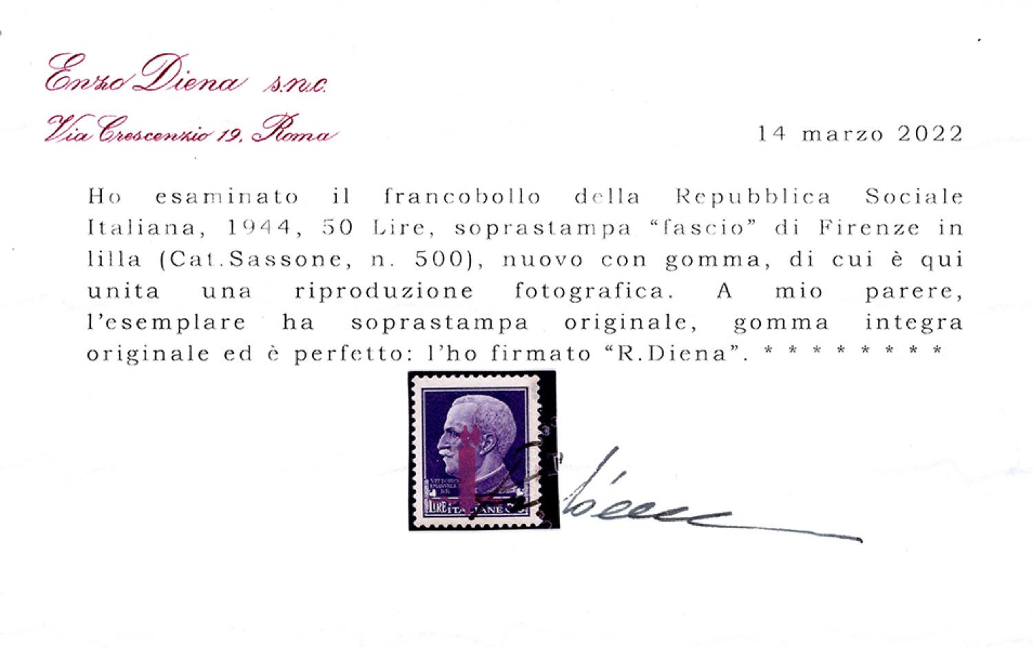 1944 - 50 lire soprastampa fascio in lilla, tiratura di Firenze (500), nuovo, gomma originale integra, perfetto e ben centrato. G.Oliva, cert. Diena.