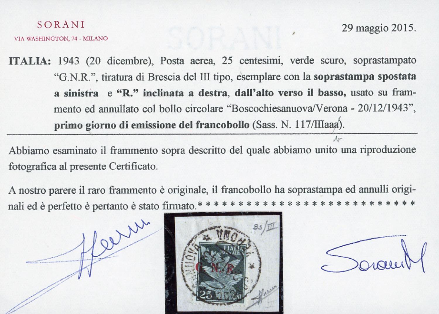 1943 - 25 cent. soprastampa G.N.R. di Brescia, III tipo, fortemente spostata a sinistra e R inclinata dall'alto al basso (117/IIIaab), perfetto, usato su frammento a Boscochiesanuova 20/12/1943, primo giorno d'emissione. INSIEME UNICO, rarità del settore. Cert. Sorani.