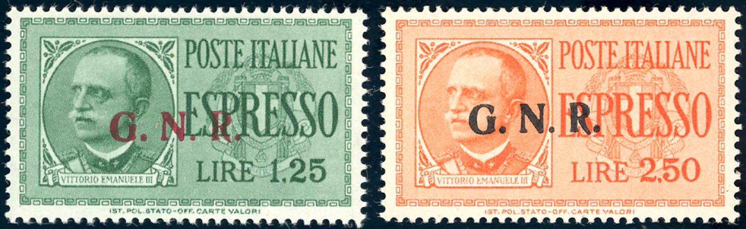 1943 - 1,25 lire e 2,50 lire soprastampati, tiratura di Brescia, "G.N" del II tipo, "R" del III tipo (19/IIa,20/IIa), gomma originale, ... Leggi tutto