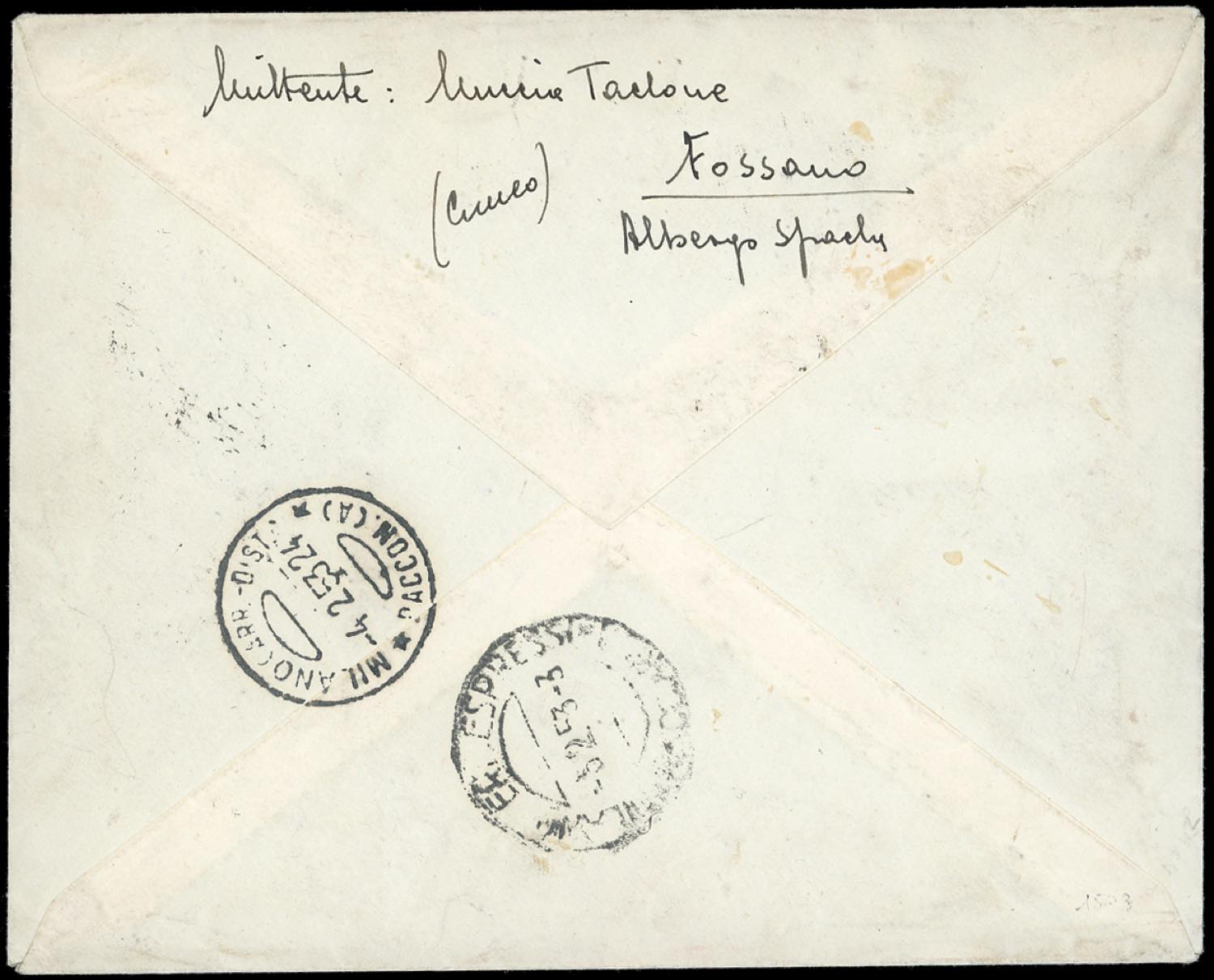 1953 - 100 lire Lavoro, dent. 13 1/4 x 14 1/4, dentellatura sinistra fortemente spostata a destra, bordo di foglio a sinistra, in coppia con l'esemplare normale, 5 lire Lavoro (651ia+651+637), perfetti, su raccomandata espresso da Milano 4/2/1953 per città. Bella e rara varietà! Fiecchi, G.Oliva, cert. Ferrario e Diena.