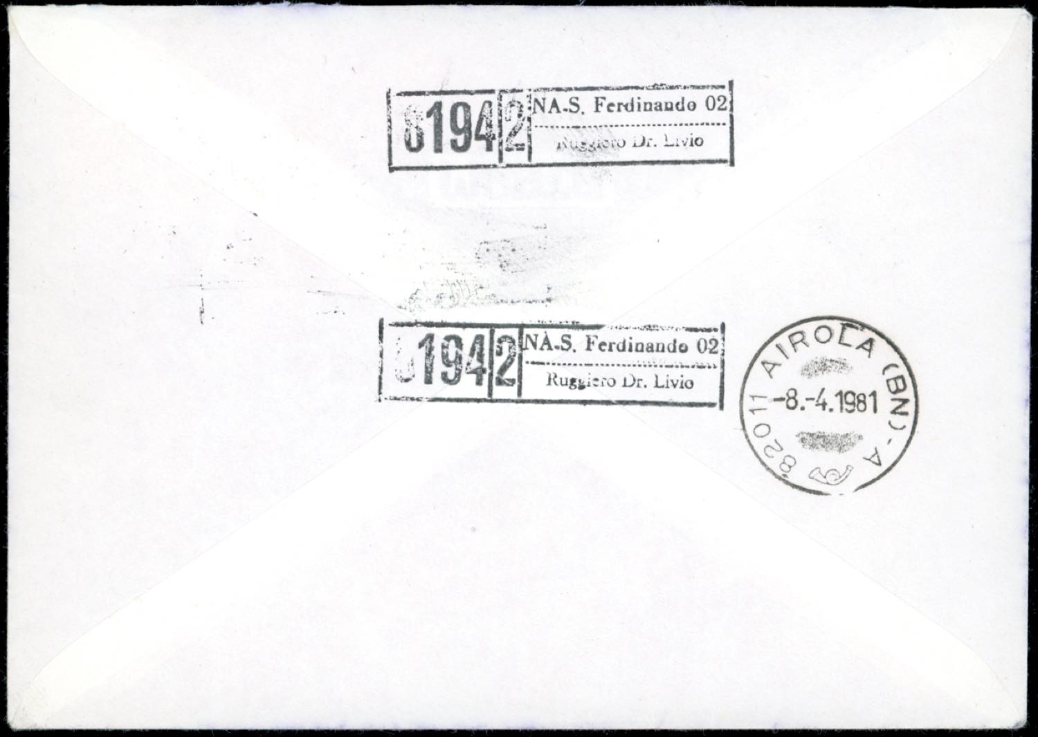 1981 - 1000 lire S.Giorgio, falso per posta di Napoli, 40 lire Siracusana, tre esemplari (F811,1075), perfetti, su busta raccomandata per espresso da Napoli 6/4/1981 ad Airola. Rara. Cert. Ferrario.