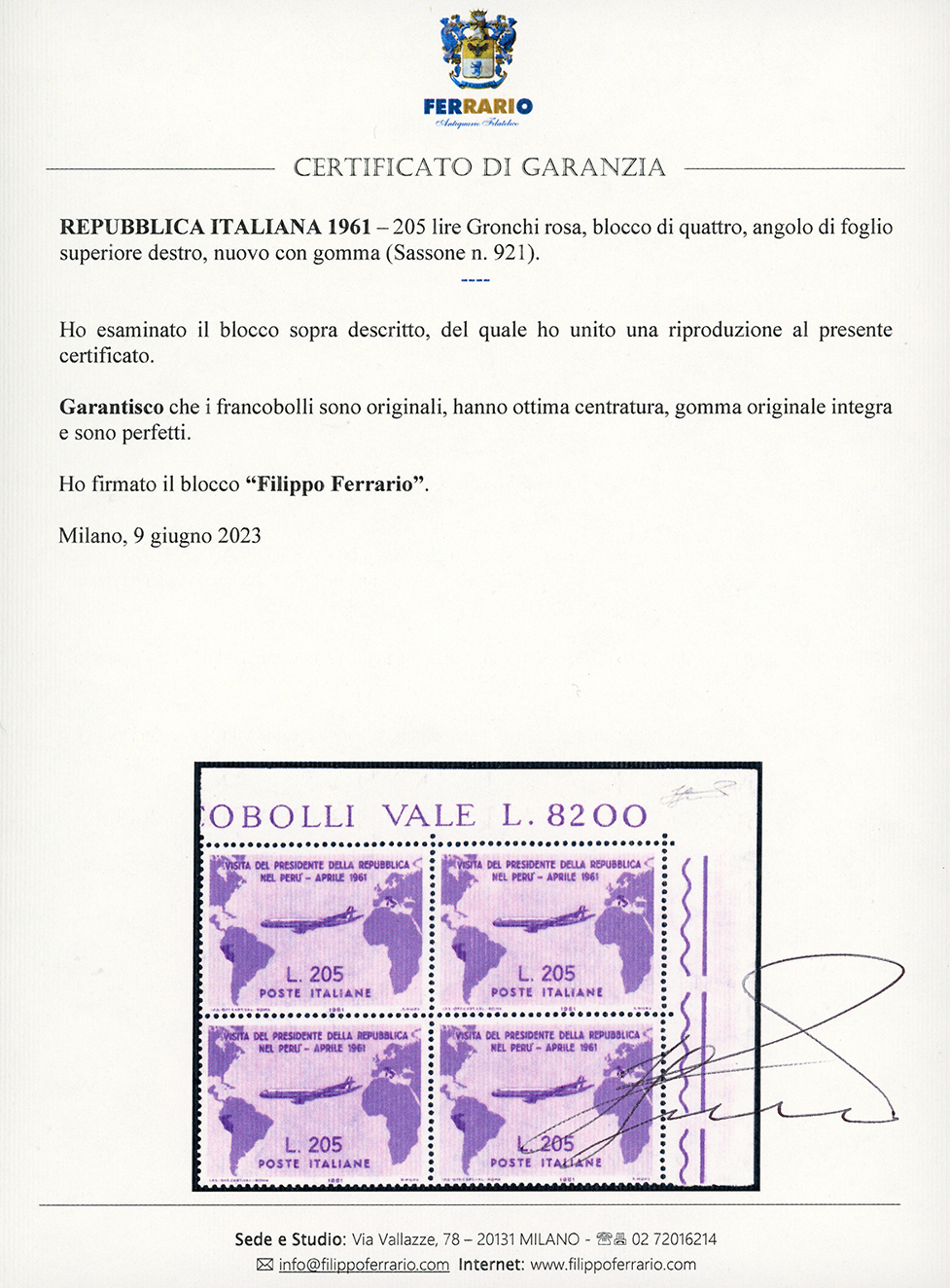 1961 - 205 lire Gronchi rosa (921), blocco di quattro, angolo di foglio superiore destro, gomma originale integra, perfetto. Splendido ed ottimamente centrato. Cert. Ferrario.