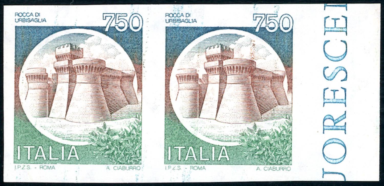 1990 - 750 lire Castelli, coppia orizzontale non dentellata (1524Ae), bordo di foglio, gomma originale integra, perfetta. Ferrario.