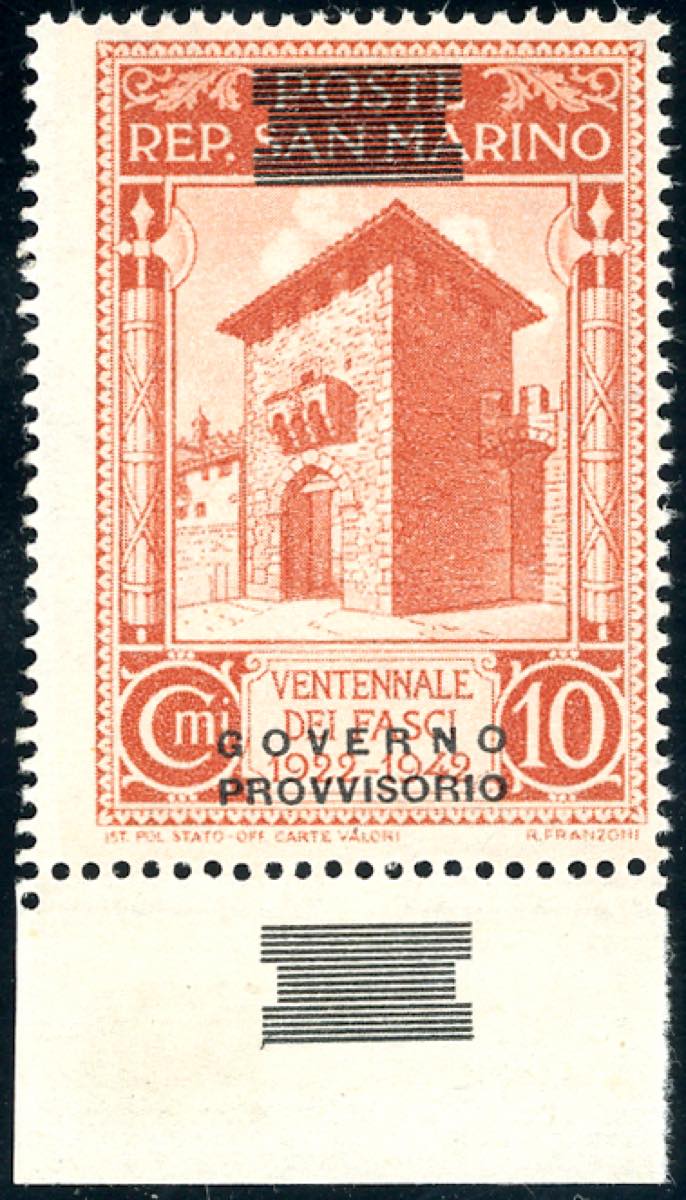1943 - 10 cent. soprastampa "Governo Provvisorio" di tipo diverso fortemente spostata in basso e sbarrette ripetute anche sul bordo ... Leggi tutto
