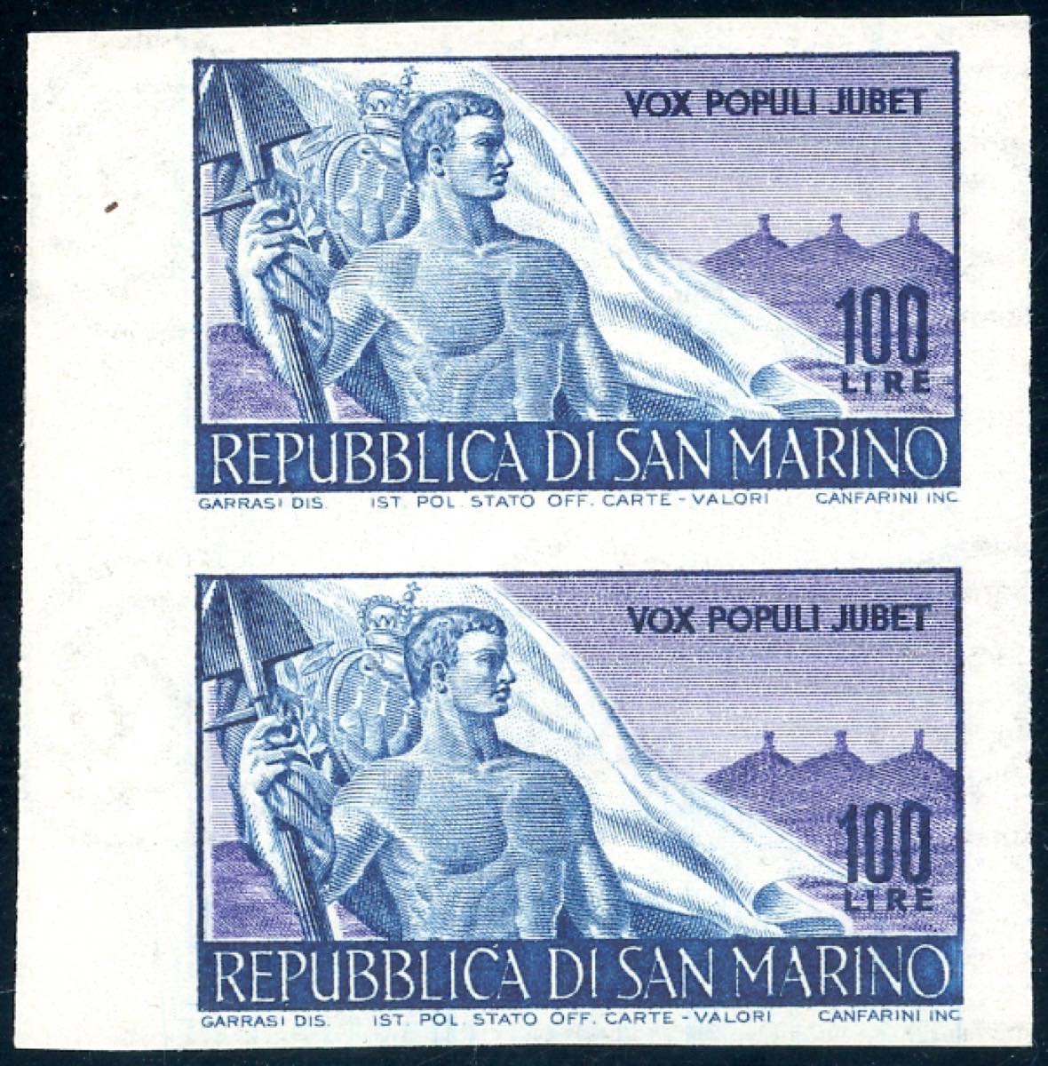 1948 - 100 lire Lavoro, coppia orizzontale non dentellata (340a), bordo di foglio, gomma originale integra, perfetta. Rara. Cert. Ferrario.
