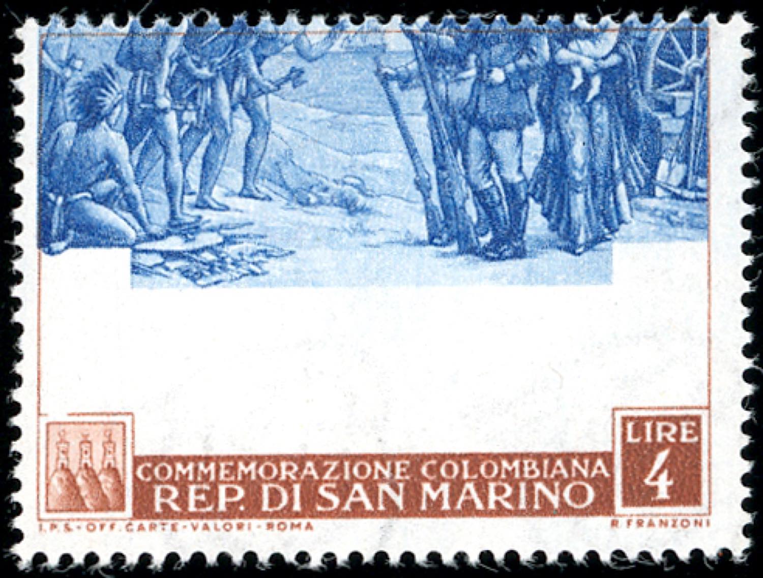 1952 - 4 lire Colombo, centro fortemente spostato in alto (375b), gomma originale integra, perfetto. Caffaz, Ferrario.