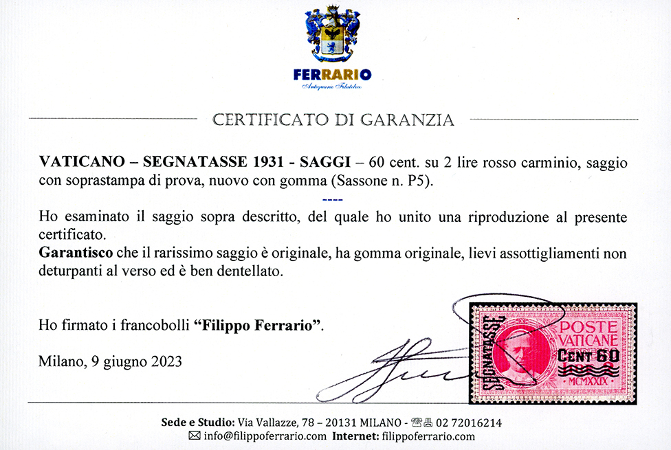 SAGGI 1931 - 60 cent. su 2 lire rosso carminio, SOPRASTAMPA DI PROVA (P5), nuovo, gomma originale, lievi assottigliamenti non deturpanti al verso, ben dentellato. Esemplare rarissimo di cui si conoscono solo pochi esemplari. Cert. Ferrario. La quotazione di catalogo indicata è per francobolli difettosi.