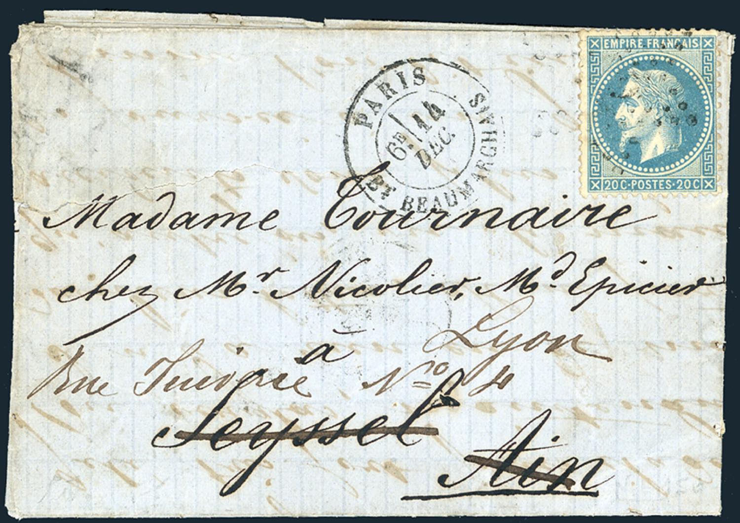 FRANCIA POSTA AEREA BALLON MONTE' 1870 - 20 cent. Napoleone III laureato (29A), perfetto, su aerogramma da Parigi 14/12/1870 a Seyssel, successivamente rispedito a Lione, probabilmente trasportato con il Ballon Montè "Le Parmentier".