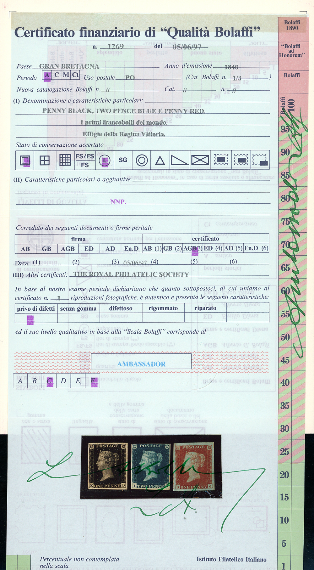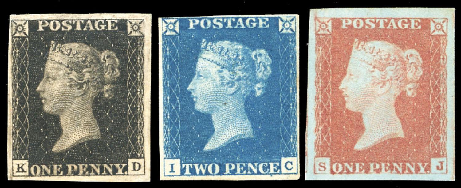 GRAN BRETAGNA 1840/41 - 1 penny nero, tavola VIII, lettere K-D, perfetto e ben marginato, 2 pence azzurro, tavola I, lettere I-C, perfetto e molto fresco, 1 penny rosso, lettere S-J, eccezionale per margini e freschezza (1,2,3), tutti nuovi, gomma originale, MLH. Insieme raro e di ottima qualità. Cert. RPS per i n.1 e 2 e cert. Finanziario Bolaffi per i tre valori.