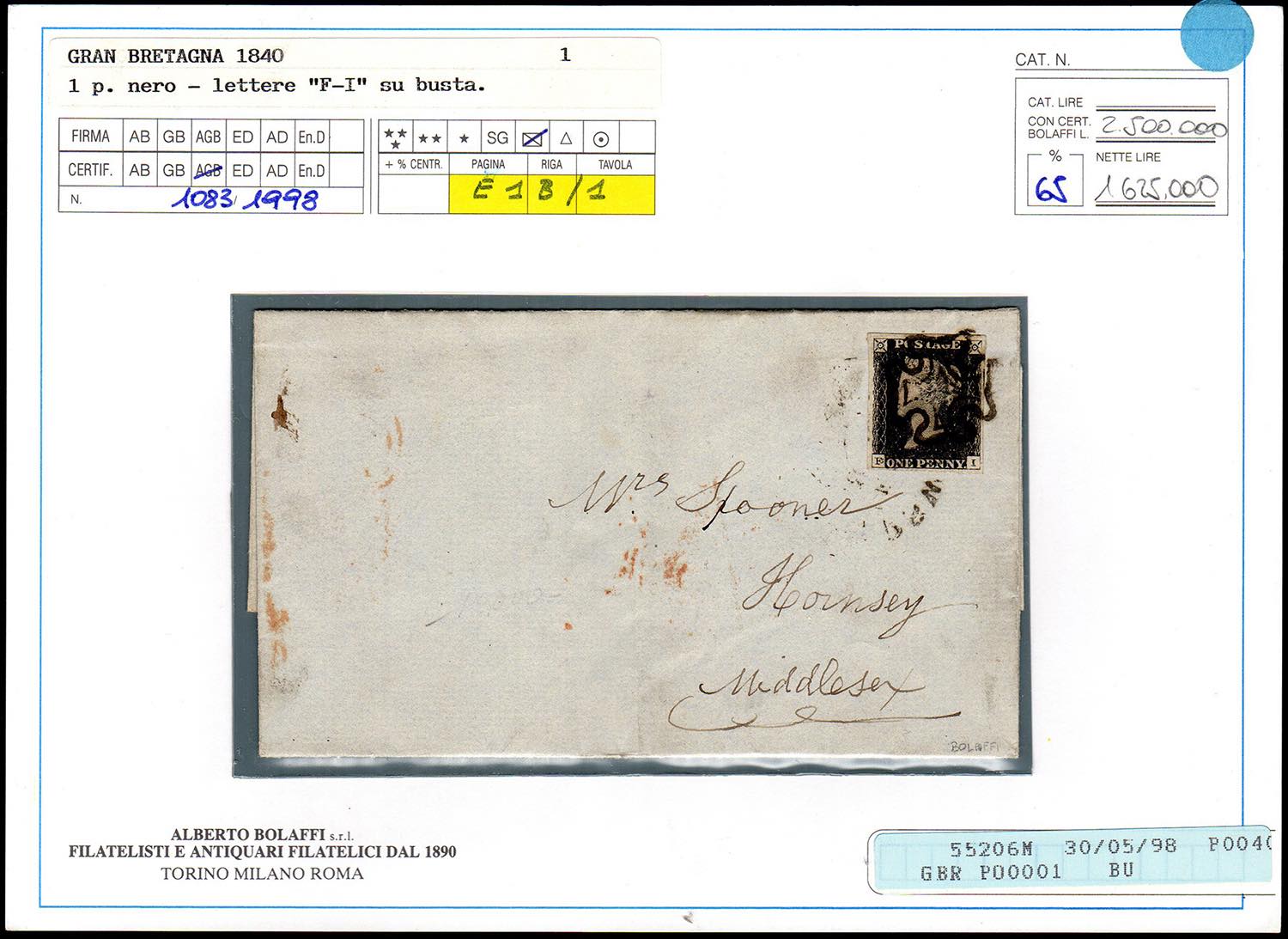 GRAN BRETAGNA 1841 - 1 p. Penny Black (1), lettere F-I, perfetto e ben marginato, su lettera da Ipswich 27/2/1841 a Hornsy, Londra. Bella. Cert. Finanziario Bolaffi 65%.