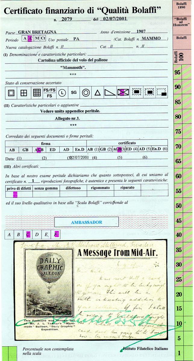 GRAN BRETAGNA POSTA AEREA 1907 - Cartolina ufficiale del Volo Gran Bretagna-Svezia-Gran Bretagna, trasportata sul pallone Mammoth. Splendida e rara. Cert. Finanziario Bolaffi.
