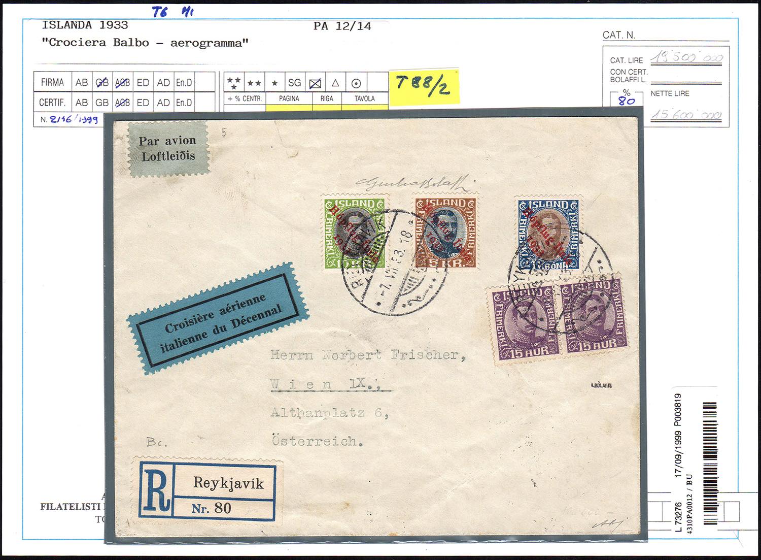 ISLANDA POSTA AEREA 1933 - Soprastampati per la Crociera Nord Atlantica di Balbo, serie completa , con complementari (A12/A14,89), perfetti, su fresco aerogramma raccomandato da Reykjakik 7/7/1933 a New York, con destinazione finale Vienna, bolli di transito e arrivo al verso. Rara testimonianza dall'Islanda della Crociera aerea del Generale Balbo, di splendida qualità. Giulio Bolaffi (per esteso), cert. Finanziario Bolaffi 80%.