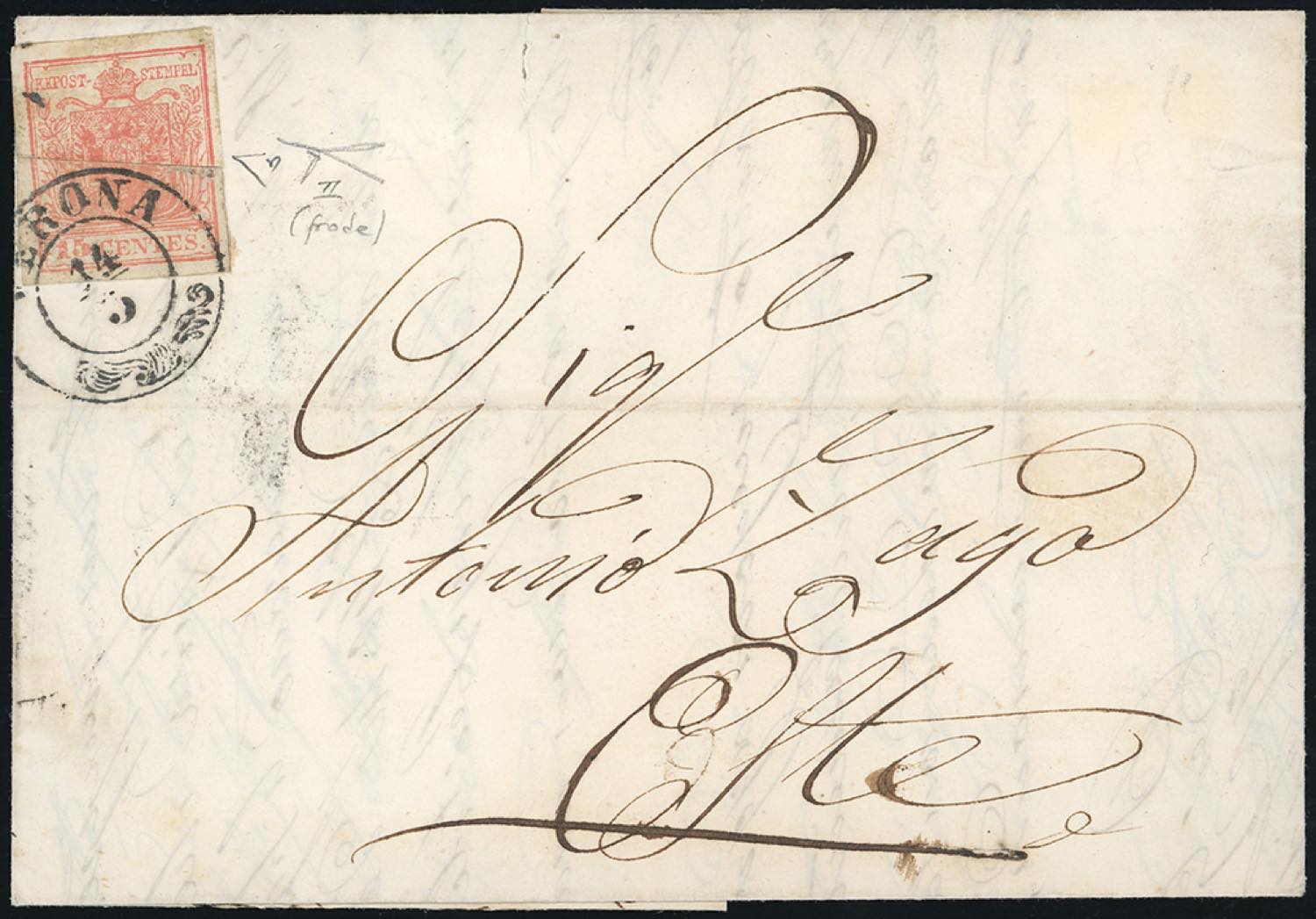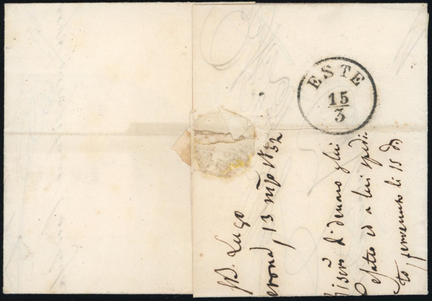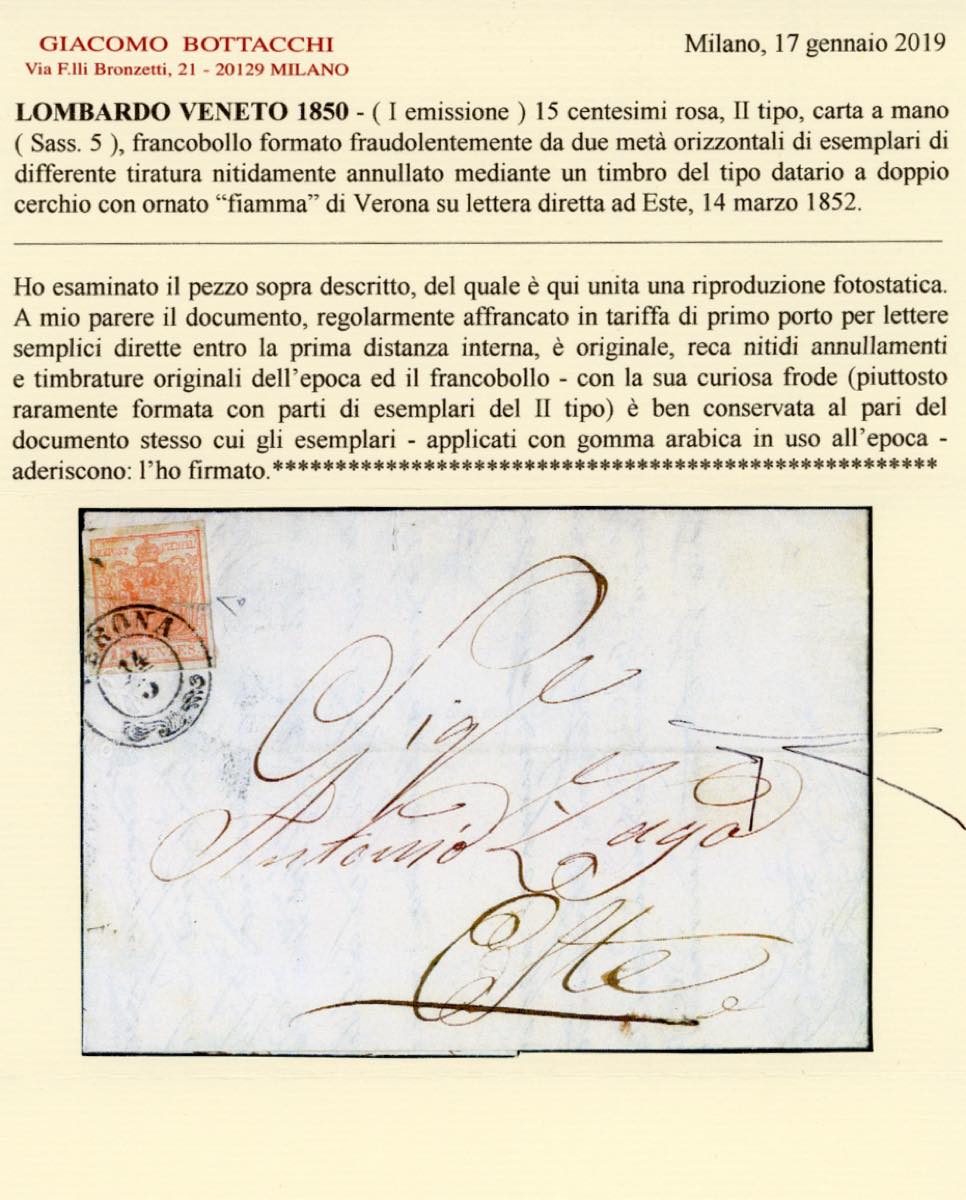 1852 - 15 cent. rosa, II tipo (5), francobollo formato da due metà orizzontali di differente tiratura, applicato in frode postale, su lettera da Verona 14/3/1852 ad Este. Insieme raro! Cert. E.Diena e Bottacchi.